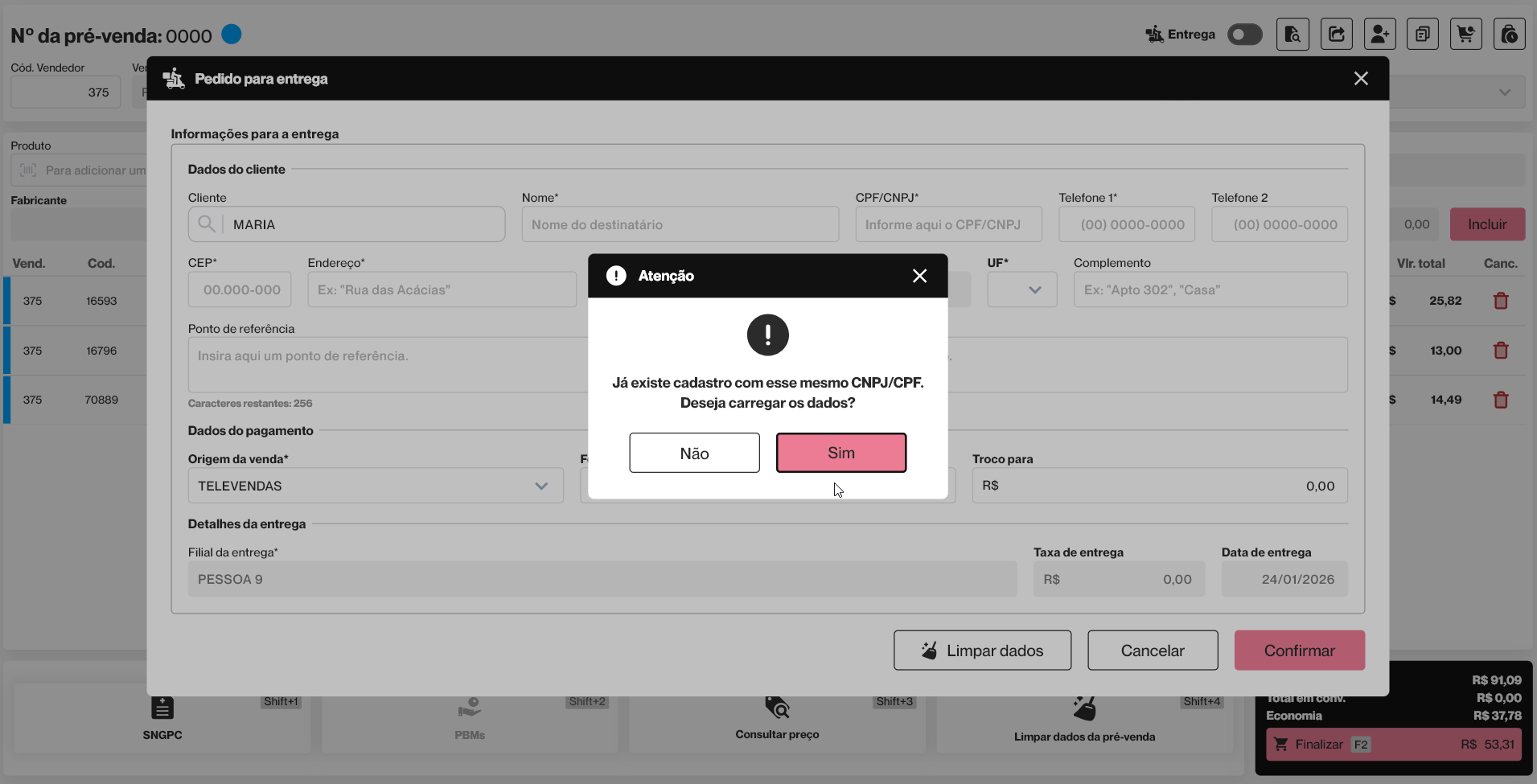 Ao realizar a pesquisa e selecionar o cliente, o sistema exibirá uma mensagem informando que já existe cadastro para a informação inserida e questionando se o vendedor deseja carregar os dados na tela.