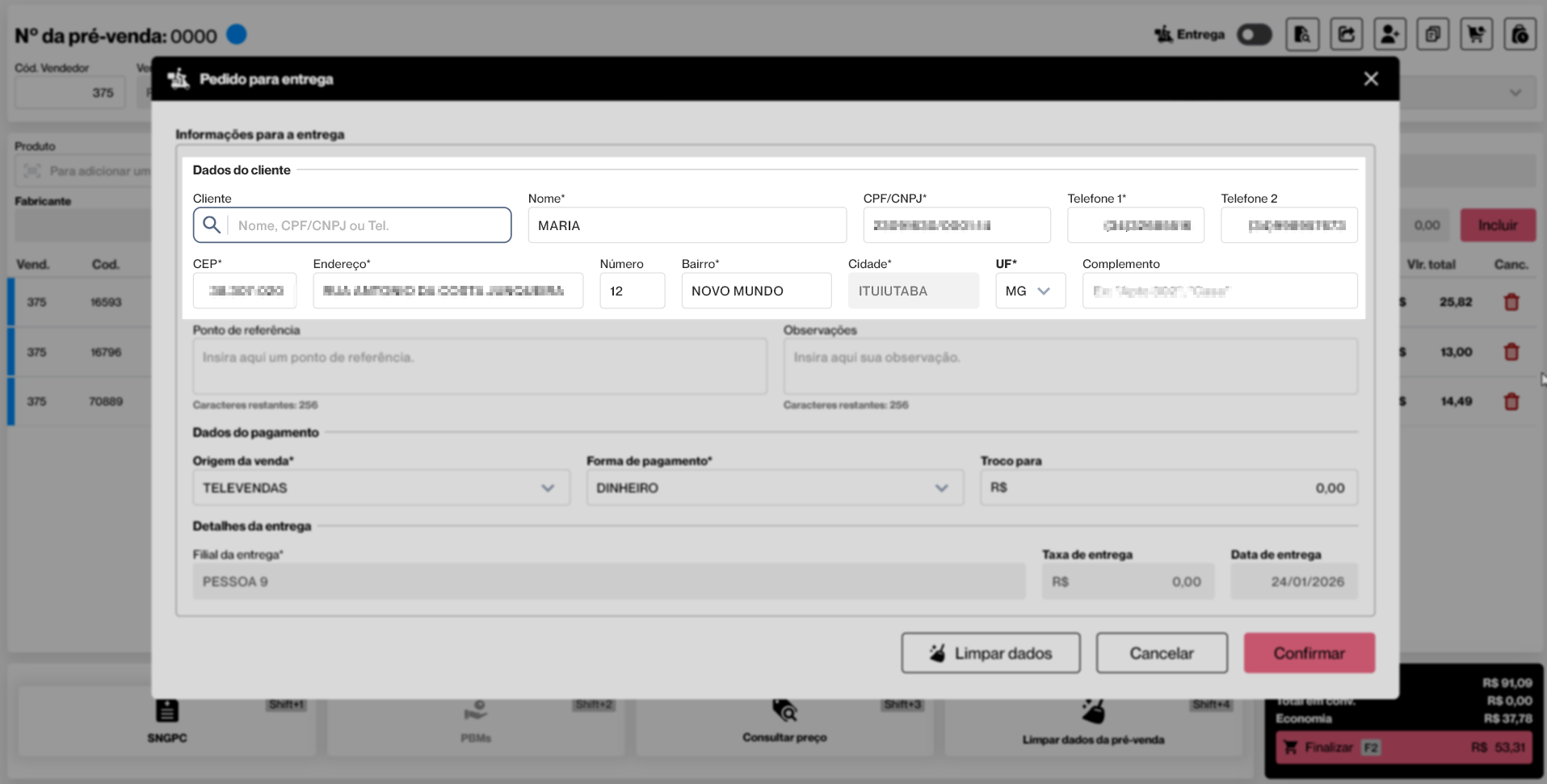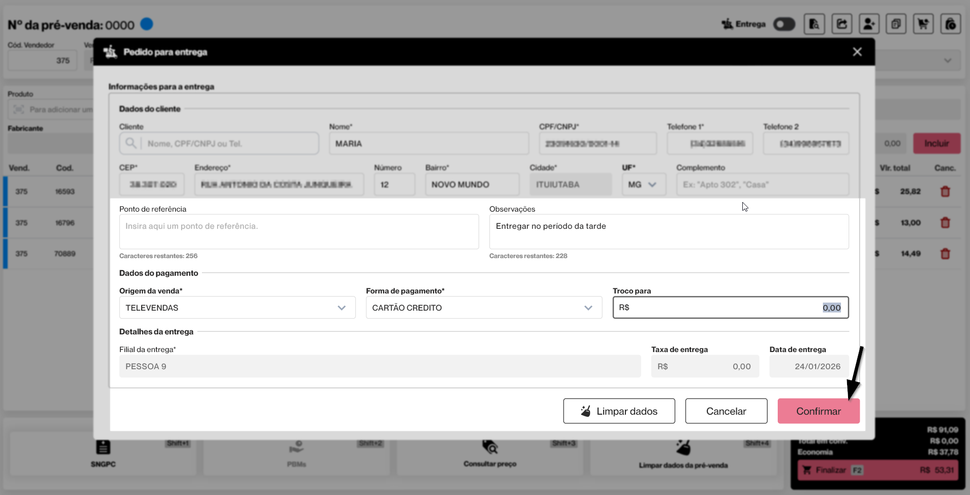 Em seguida, o operador deverá informar o endereço de entrega do cliente, incluindo observações se necessário. Após, os dados de pagamento, indicando a forma de pagamento desejada e, se aplicável, o valor de troco. Para concluir, o operador deve definir os detalhes da entrega, como a filial responsável, a taxa de entrega (quando houver) e a data prevista para a entrega.