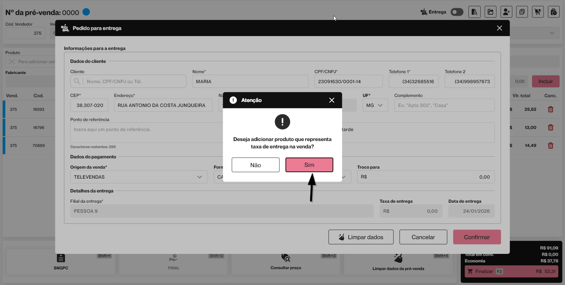 Em seguida, será exibida uma mensagem de confirmação. Mas caso a loja trabalhe com um valor fixo para a taxa de entrega, o sistema exibirá uma mensagem perguntando se deseja incluir um produto que represente essa taxa. Esse produto deve estar previamente cadastrado com o valor correspondente à taxa de entrega e deverá ser selecionado em todos os pedidos em que a cobrança da taxa for necessária. Clique em >> Sim para vincular a entrega à pré-venda.