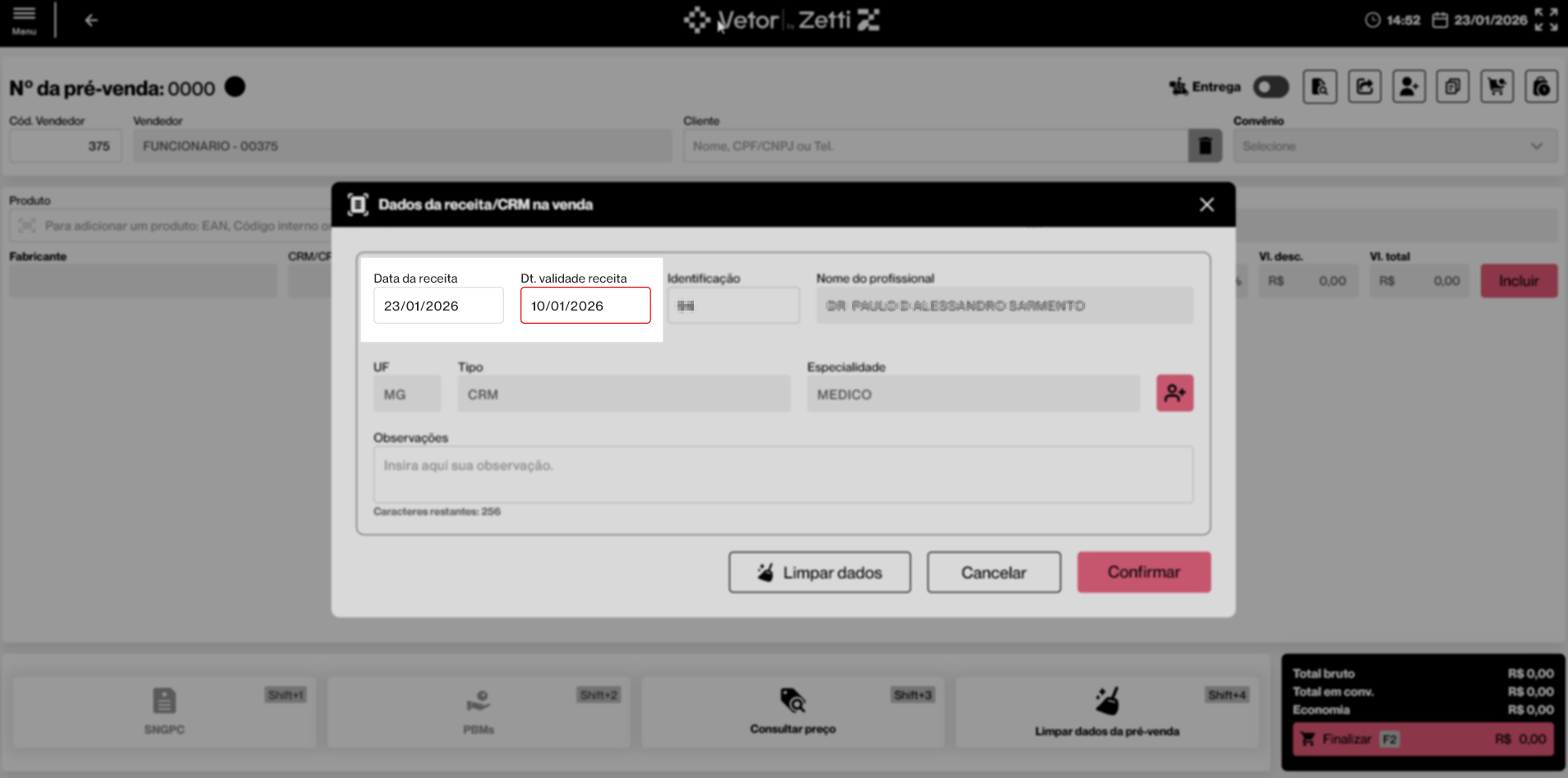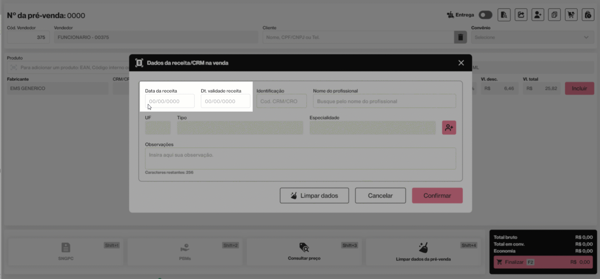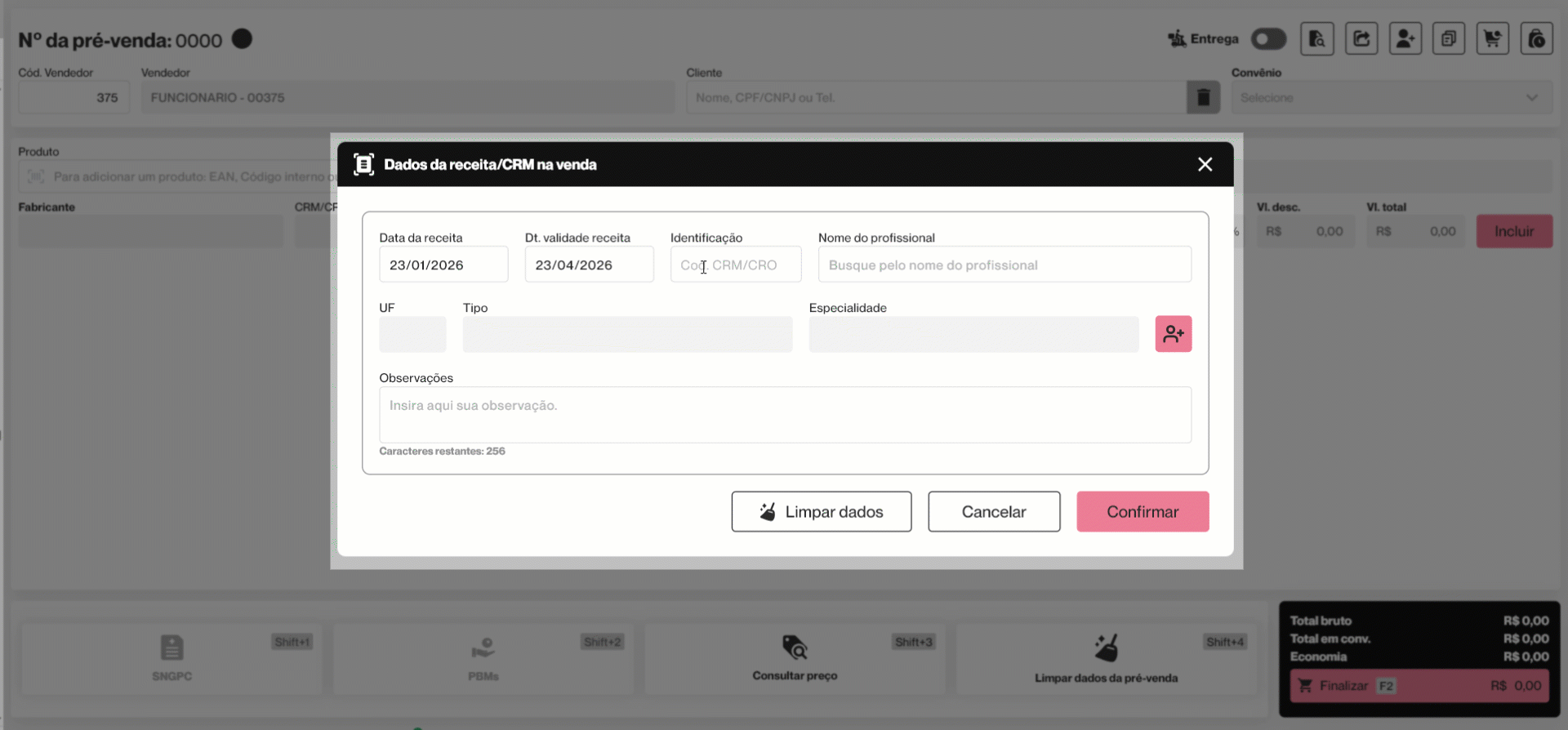 Esta operação tem como objetivo permitir o registro e a validação dos dados da receita médica durante a realização de uma pré-venda no PDV Farma, sempre que o produto incluído exigir prescrição médica. Por meio dessa funcionalidade, o vendedor informa os dados da receita e do profissional prescritor, garantindo o cumprimento das exigências legais, a validade da receita e a correta liberação do medicamento para venda.