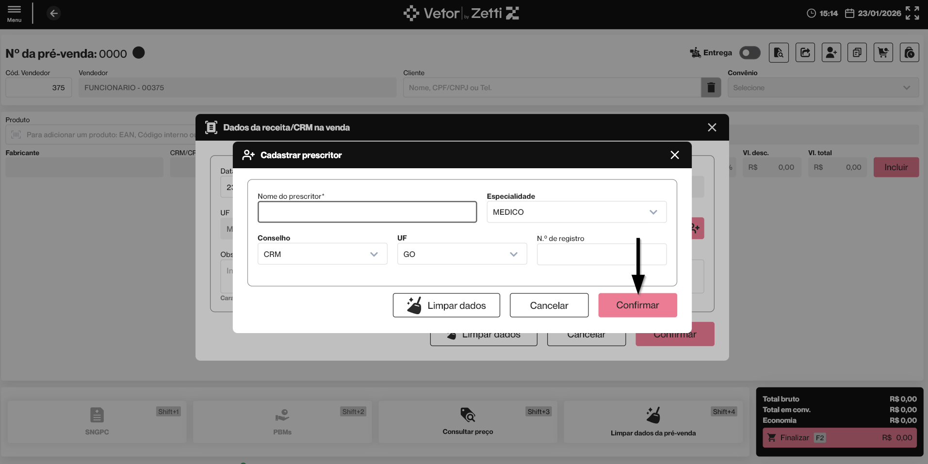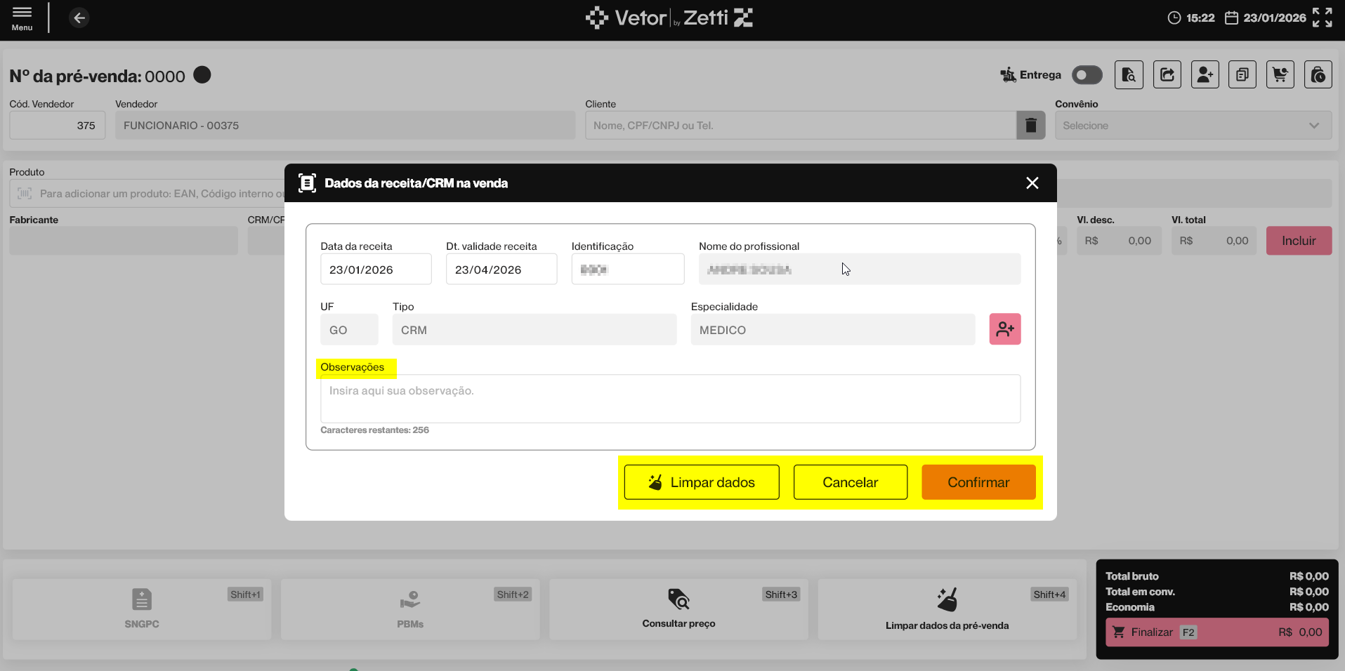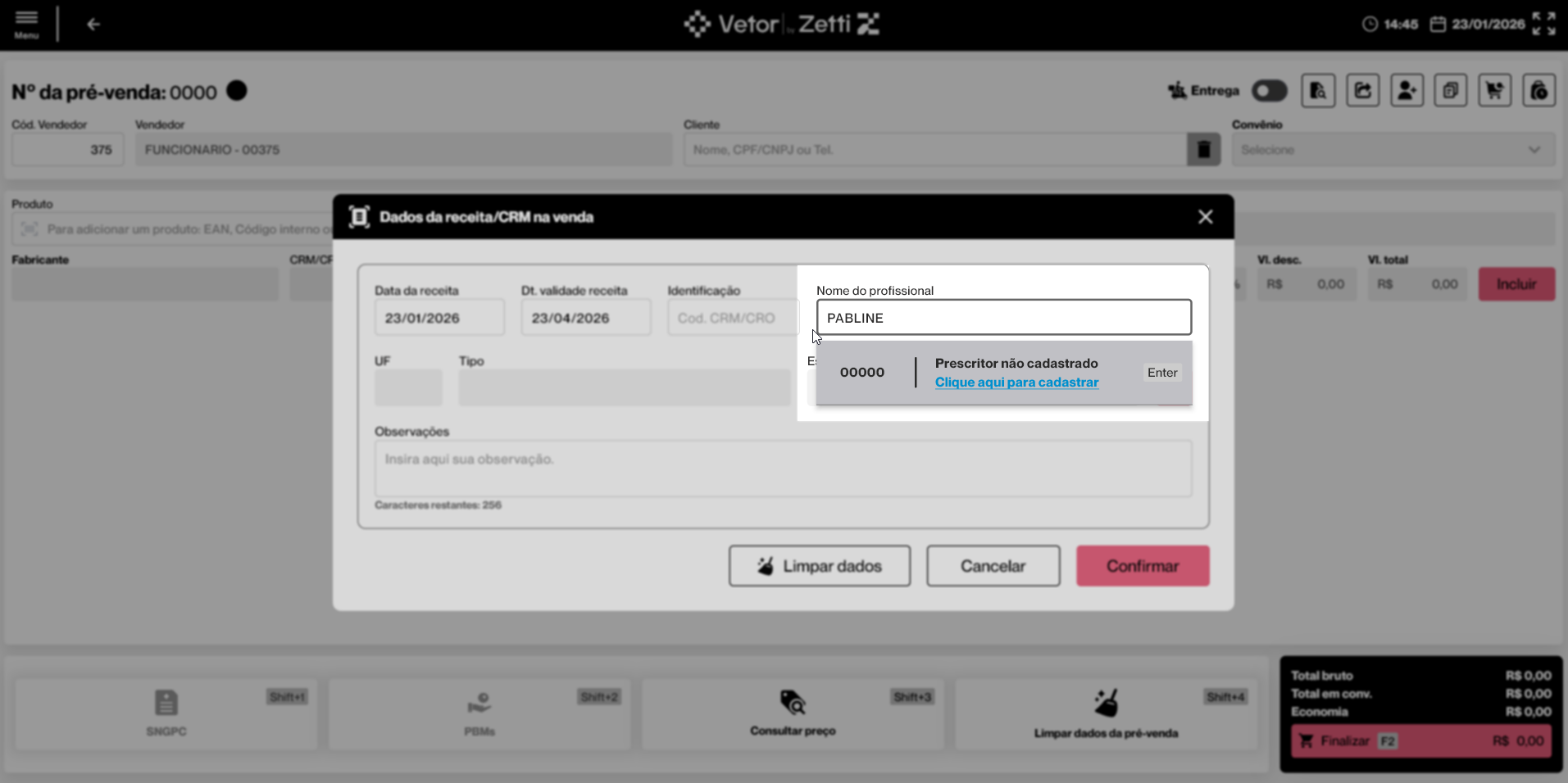 Esta operação tem como objetivo permitir o registro e a validação dos dados da receita médica durante a realização de uma pré-venda no PDV Farma, sempre que o produto incluído exigir prescrição médica. Por meio dessa funcionalidade, o vendedor informa os dados da receita e do profissional prescritor, garantindo o cumprimento das exigências legais, a validade da receita e a correta liberação do medicamento para venda.