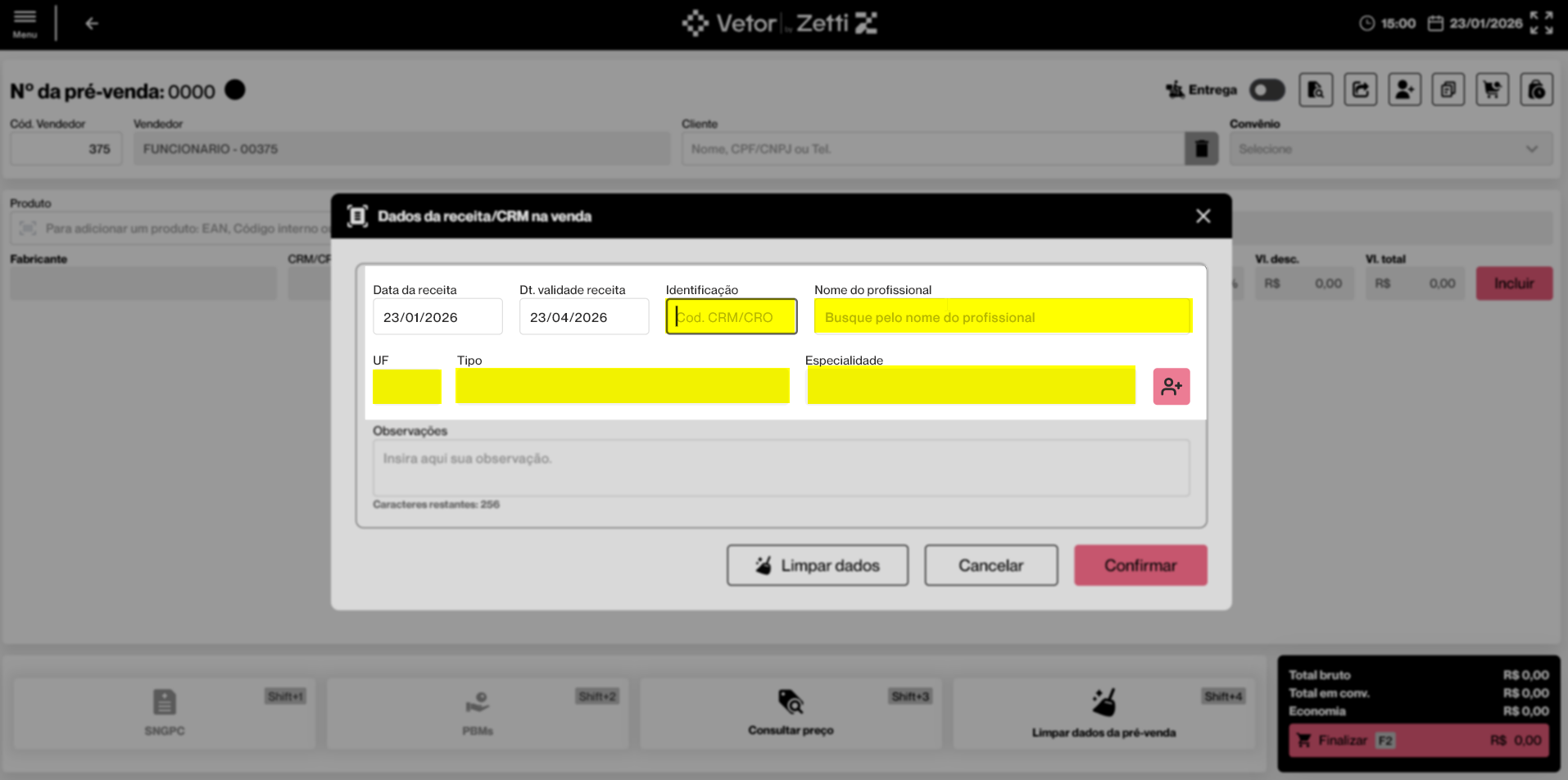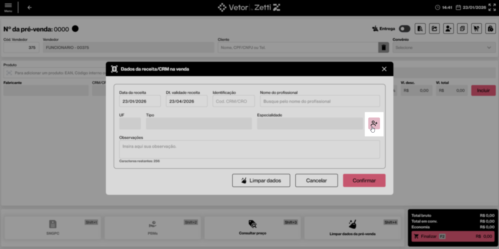 - A Pré-Venda deve estar iniciada e conter ao menos um produto incluído que exija identificação na receita. Para isso, o vendedor deve acessar a tela de Pré-Venda e realizar sua abertura. Caso necessário, clique aqui para aprender como iniciar uma Pré-Venda.