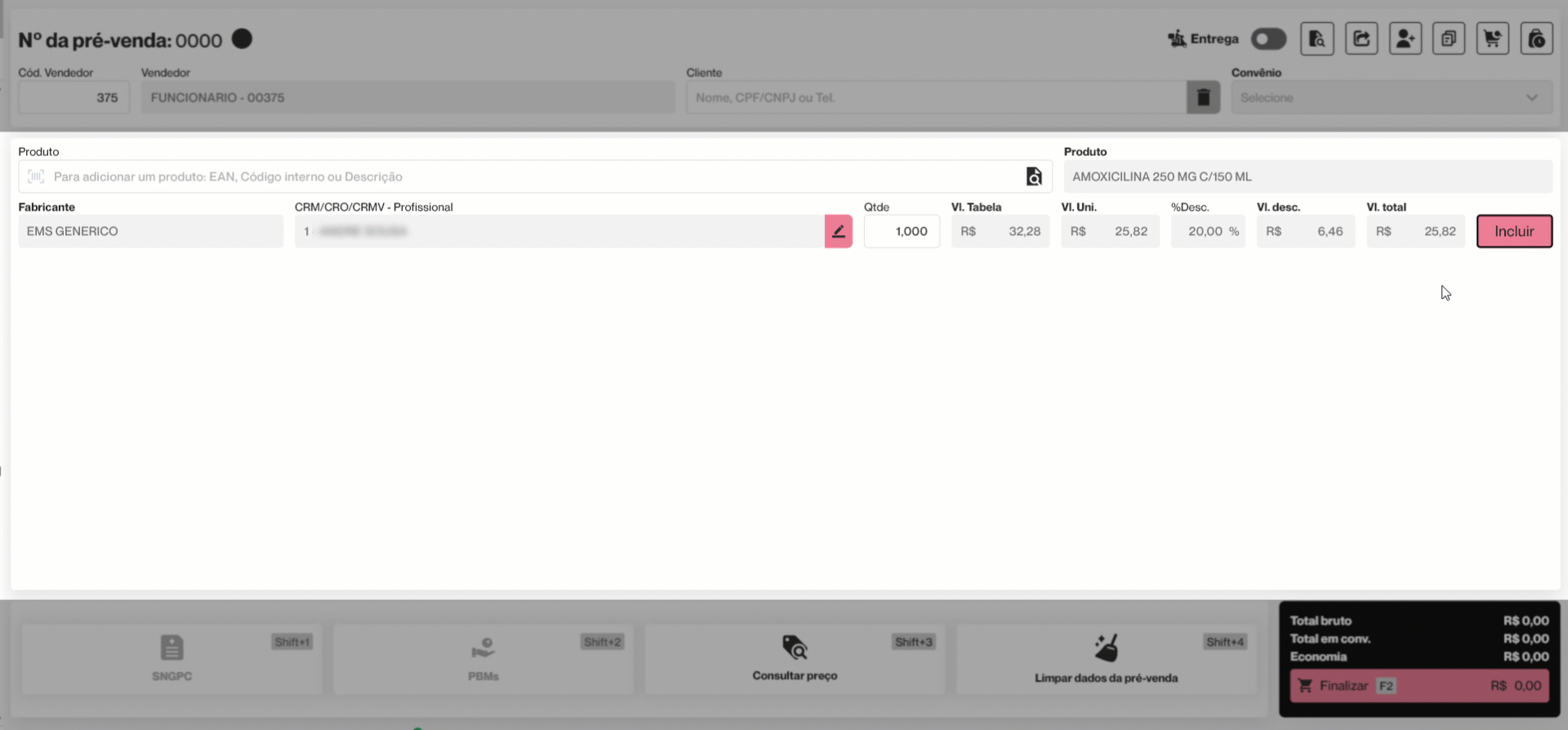 Após a confirmação do registro dos dados da receita, o vendedor será redirecionado à tela de Pré-Venda. Nessa tela, ele deverá clicar em >> Incluir. Em seguida, o produto será incluído na relação de itens. Abaixo do nome do produto, será destacado de vermelho o tipo do medicamento, indicando se é controlado, antibiótico, tarja Vermelha, protocolo especial, entre outros.