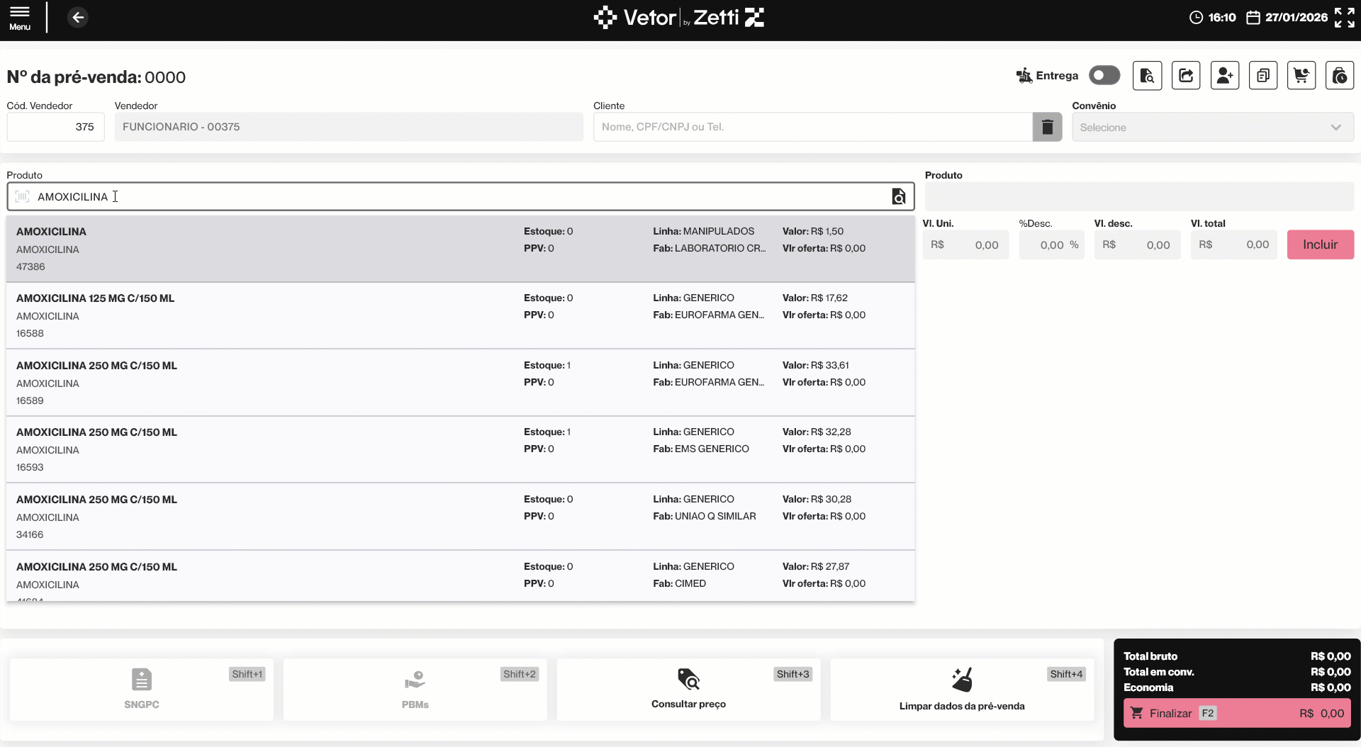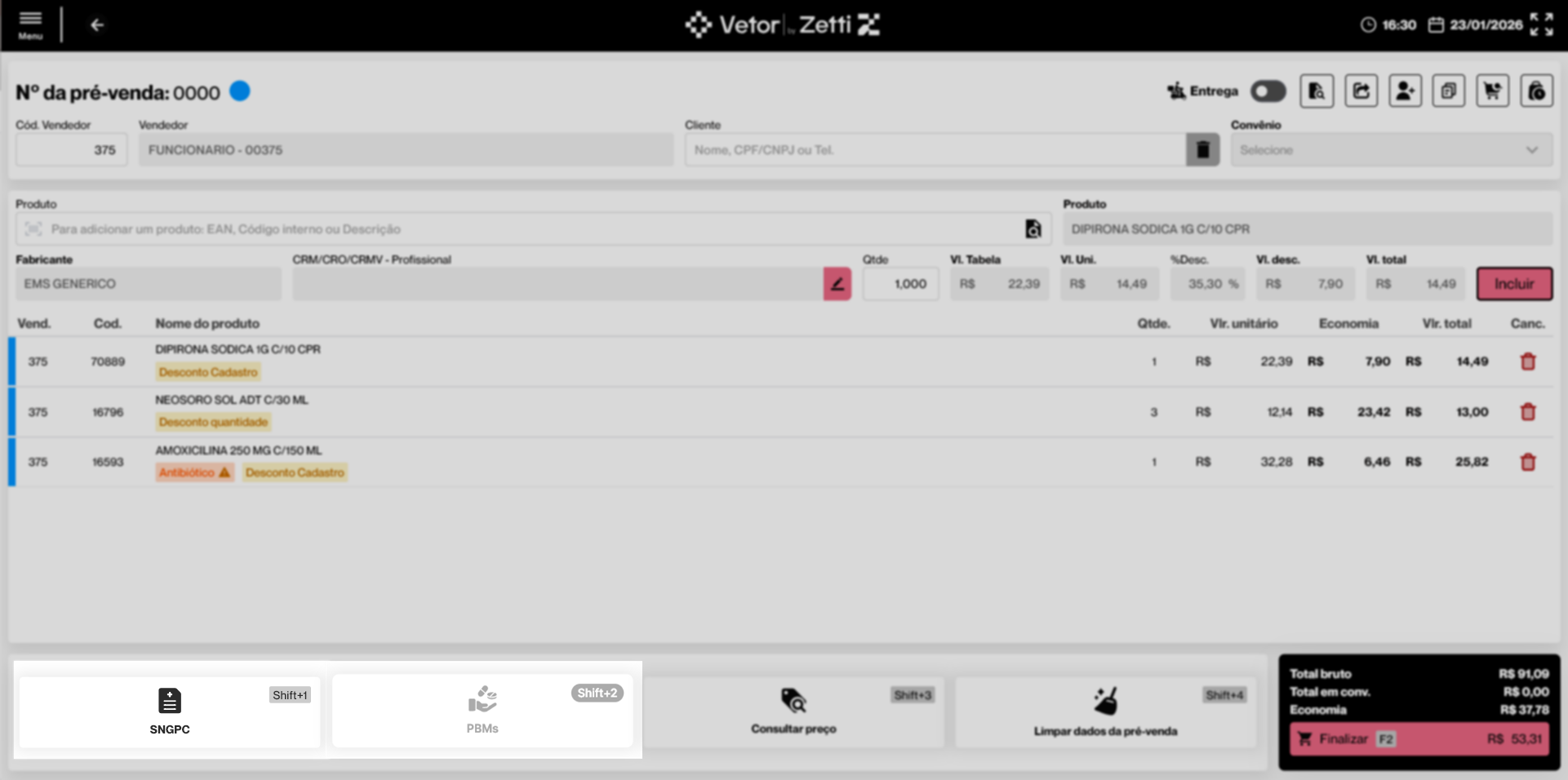 Caso o produto esteja configurado para controle SNGPC e/ou faça parte de um PBM, os botões “SNGPC” e “PBM” serão habilitados para o registro das informações correspondentes. Além disso, com os produtos listados na tela, o vendedor também poderá aplicar outras ações, como por exemplo, consultar informações detalhadas sobre preços e políticas de desconto, o que auxilia no processo de negociação com o cliente, além de ativar entrega do pedido. Clique aqui para acessar a documentação correspondente ao menu de pré-venda e escolha a funcionalidade que deseja aprender. Por outro lado, se a sua intenção é finalizar a pré-venda, clique aqui para acessar a documentação "Iniciar uma Pré-Venda (Ctrl+F2)", e em seguida, siga para o tópico "Finalizar pré-venda" para compreender o processo de finalização.