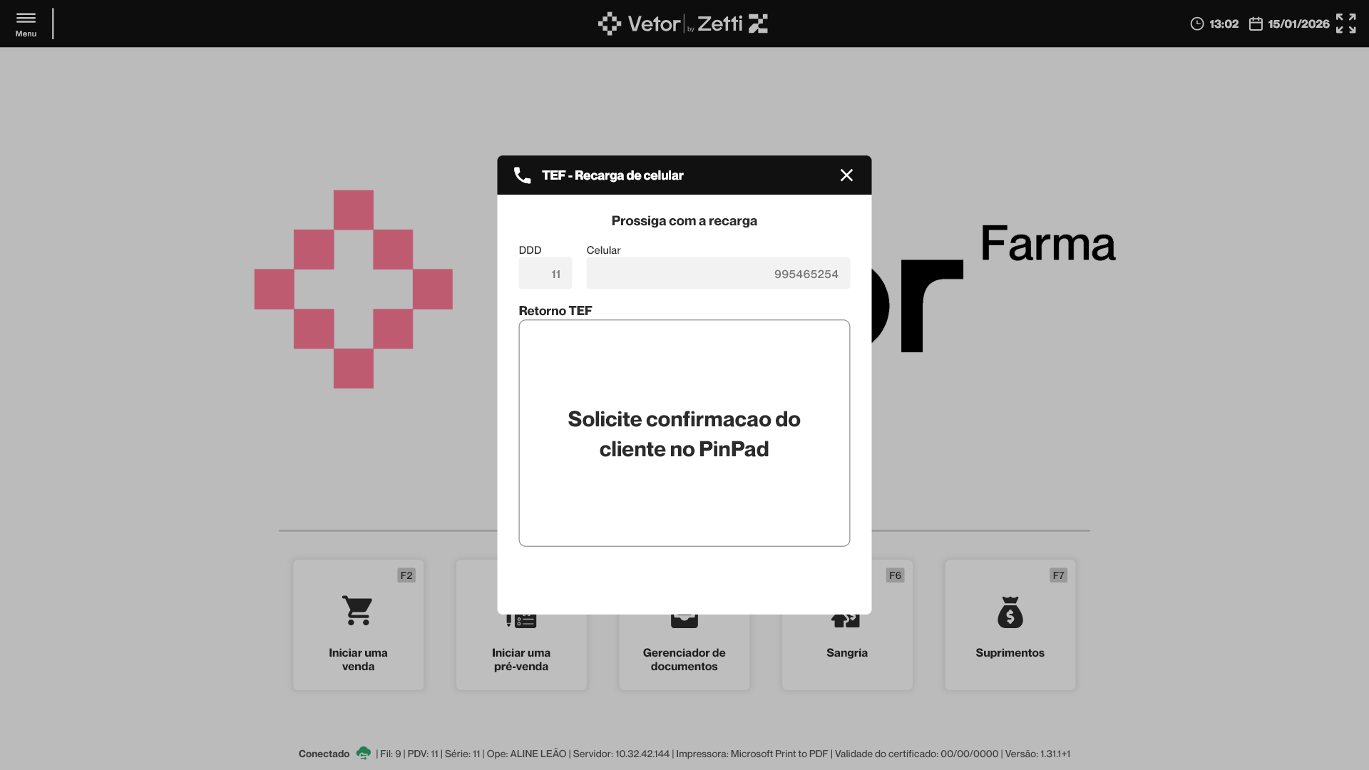 - Para que a operação de recarga seja concluída com sucesso é essencial que o TEF esteja devidamente configurado e ativo no terminal responsável pelo processamento do recebimento, pois o TEF é responsável por realizar a comunicação com a operadora, exibir a confirmação da transação ao cliente no PinPad e validar a conclusão da operação, independentemente da forma de pagamento escolhida. Caso o TEF não esteja ativo ou corretamente configurado, a recarga não poderá ser finalizada, mesmo que o pagamento seja efetuado por outro meio.