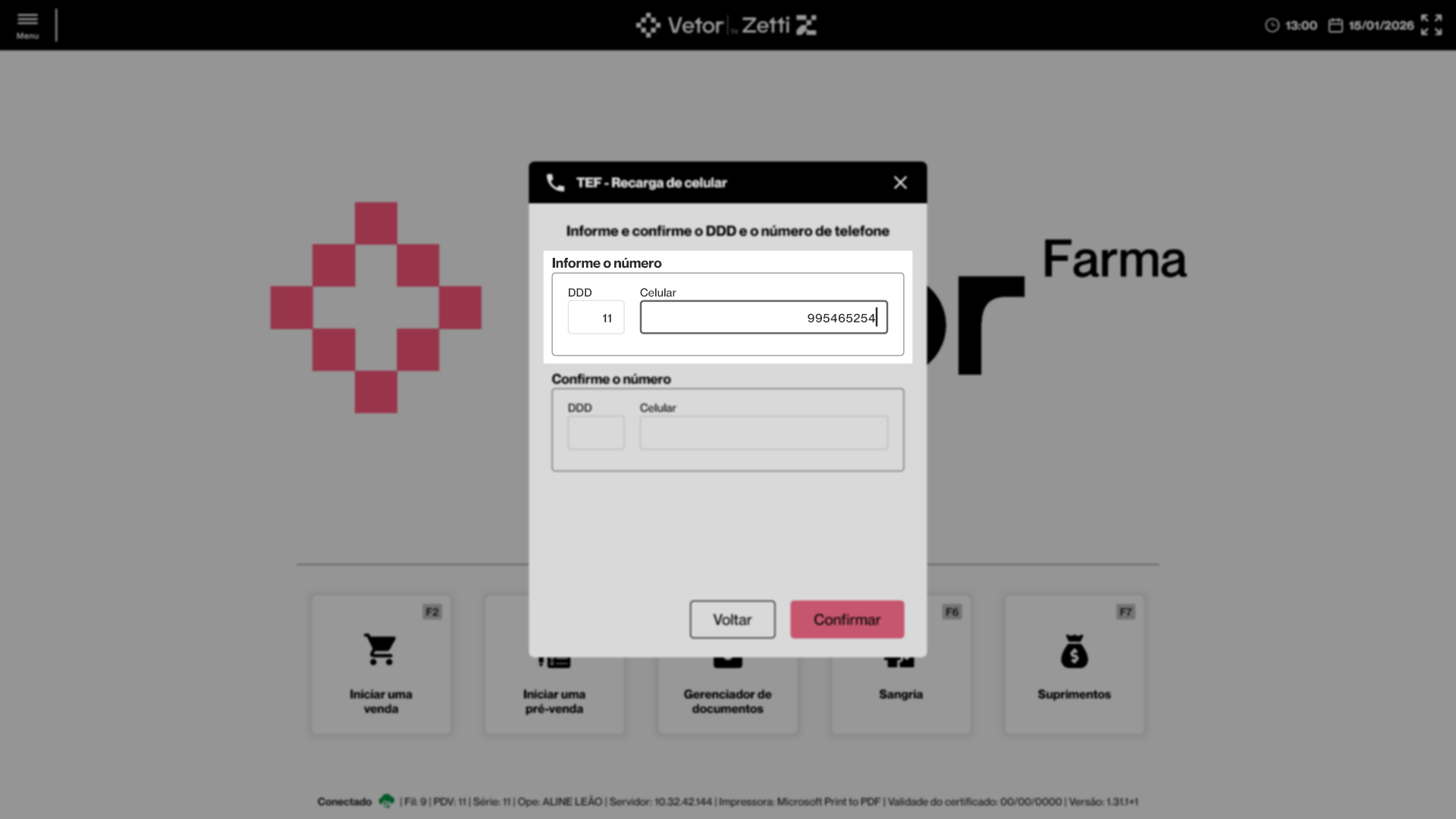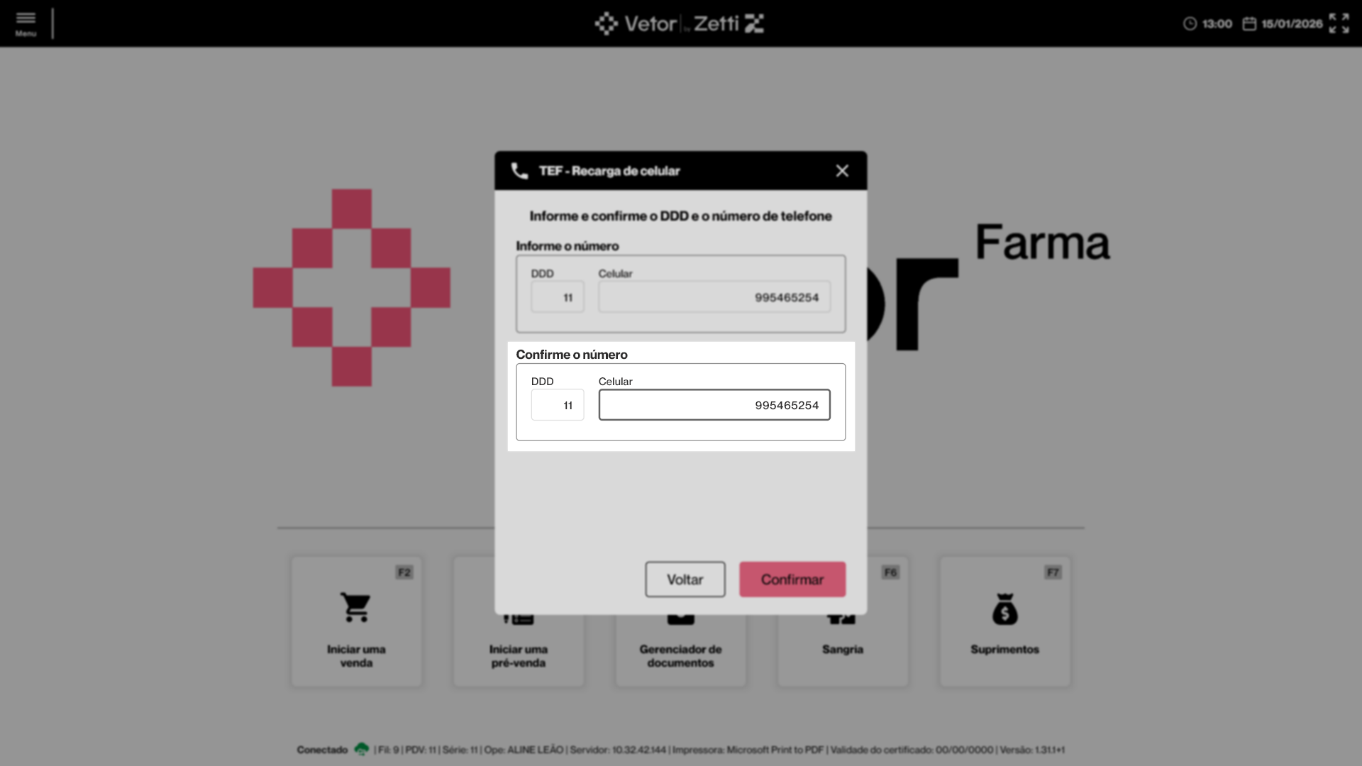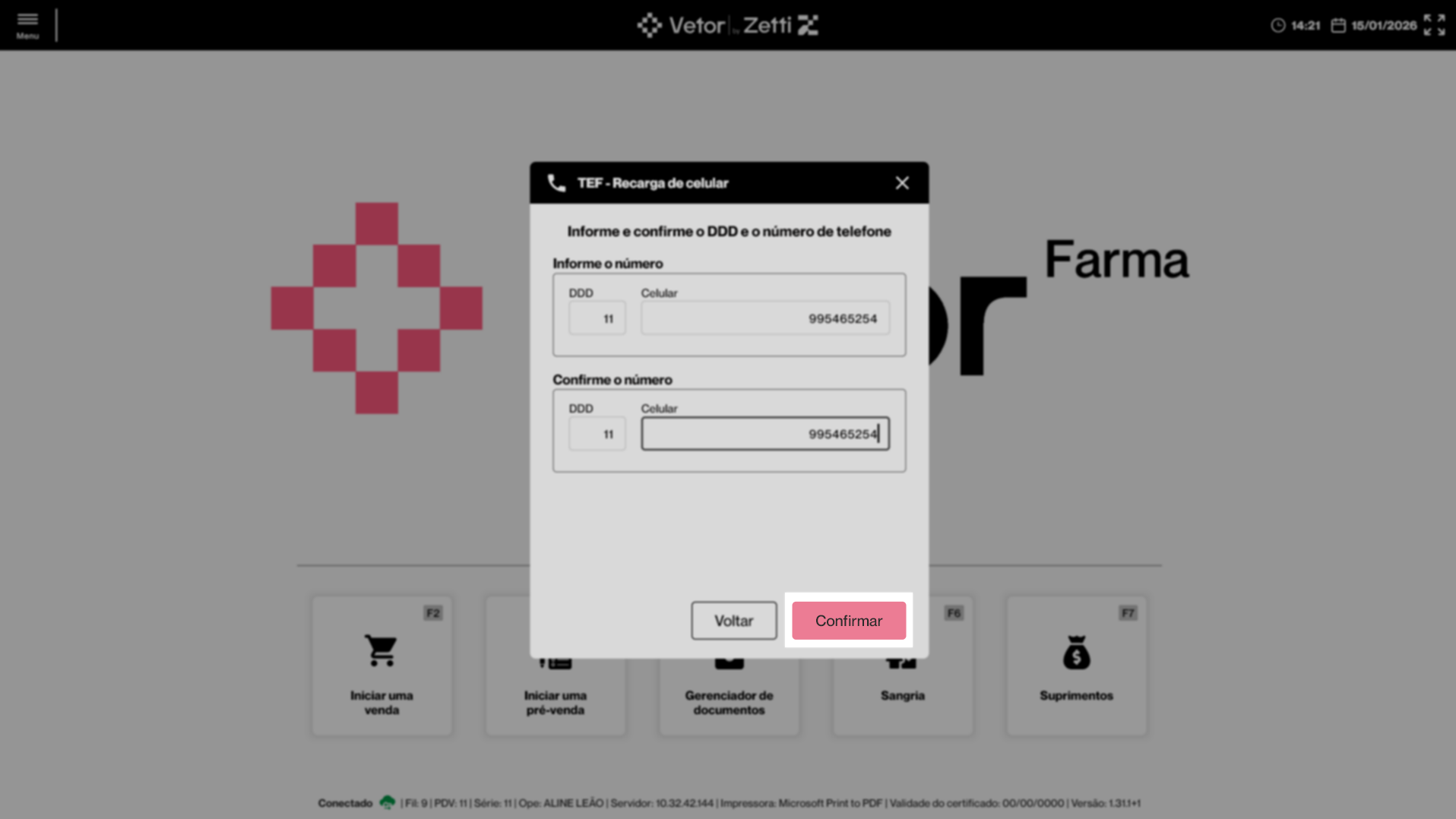 Em seguida, o sistema solicitará a confirmação do cliente no PinPad conectado. As informações da recarga estarão disponíveis na tela do PinPad, incluindo o DDD e o número do cliente, bem como o valor da recarga. Para confirmar a operação, o cliente deverá selecionar a opção de confirmação, geralmente identificada na cor verde. Caso seja necessário cancelar a operação, ele deverá selecionar a opção de anulação, geralmente identificada na cor vermelha. Neste cenário, ele poderá reiniciar o processo de recarga.