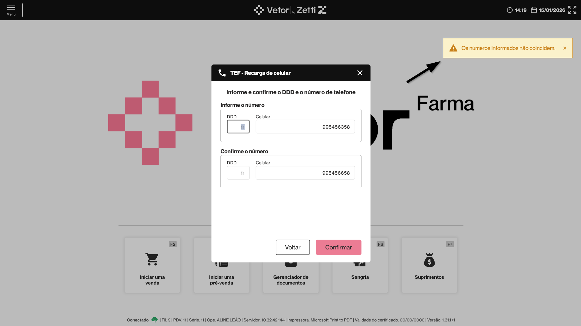 Se o número digitado para confirmação for diferente do informado anteriormente, o sistema exibirá um alerta na tela e impedirá que o operador dê continuidade ao processo.