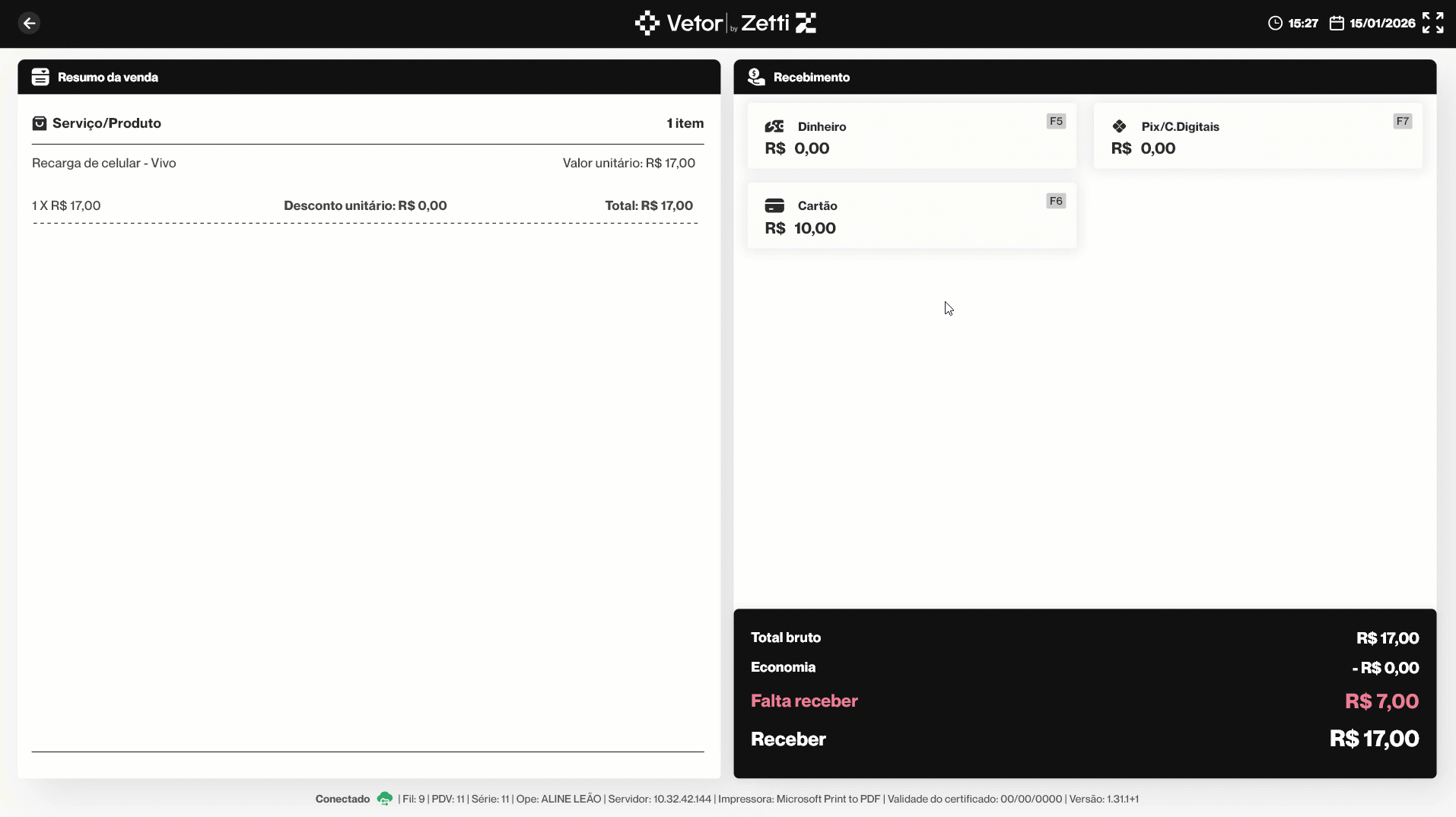 Após a confirmação do cliente no PinPad, a tela de checkout será exibida. Ela é composta por duas seções. À esquerda, é apresentado o resumo da venda, contendo o "Serviço/Produto", que neste caso corresponde à compra de recarga de celular, bem como o valor unitário e o valor total. À direita, são exibidas as formas de recebimento disponíveis e o cliente pode optar por efetuar o pagamento utilizando mais de uma delas, se desejar.