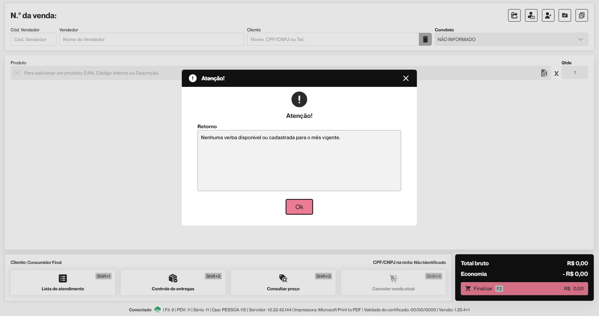 Para que esse tipo de desconto seja aplicado, é necessário que a verba de desconto esteja cadastrada para o mês vigente no Vetor Farma. Caso esse cadastro não tenha sido realizado, o sistema não permitirá a aplicação do desconto e exibirá uma mensagem de alerta na tela, impedindo a continuidade da operação, acompanhe a imagem a seguir e se necessário, clique aqui para saber mais sobre como realizar o registro da verba de desconto no Vetor Farma.