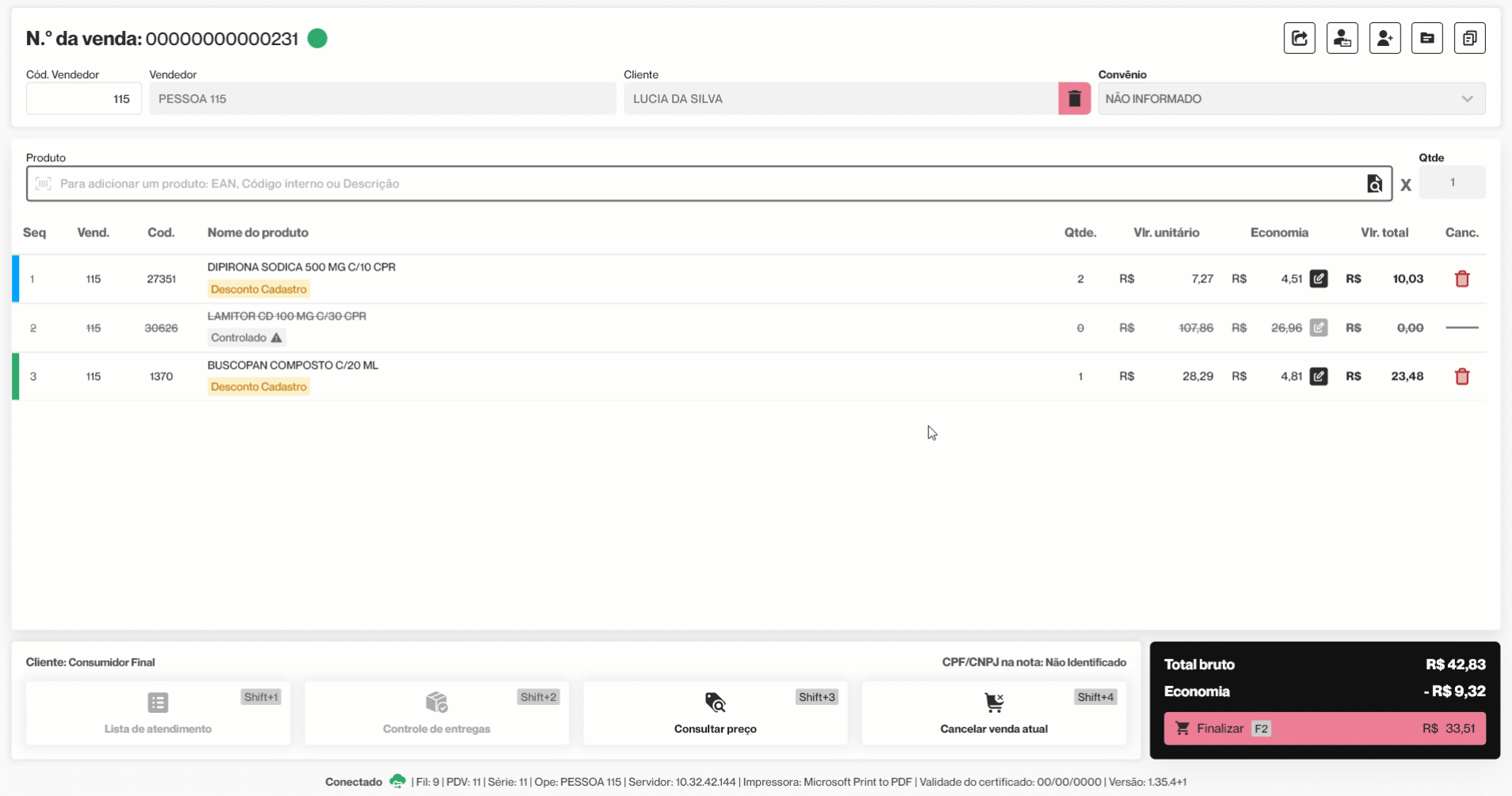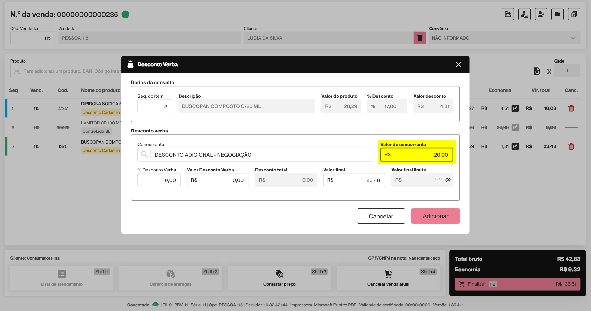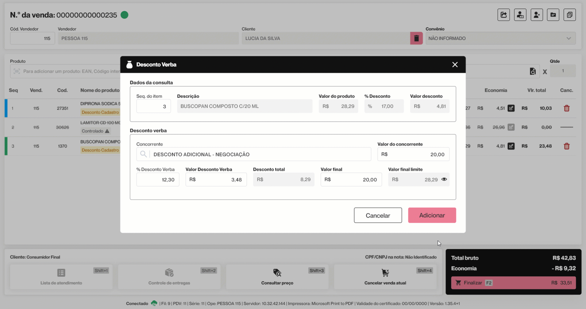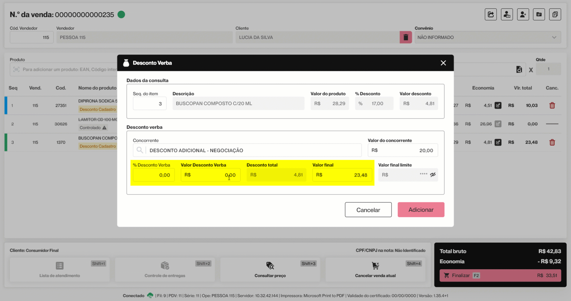 Por fim, após preencher os campos necessários, clique em >> Adicionar. A tela será fechada e o desconto aplicado ficará visível na venda por meio das colunas: "Economia", que apresenta o valor total dos descontos concedidos por produto, e "Vlr total", que exibe o valor total do produto com os descontos aplicados.