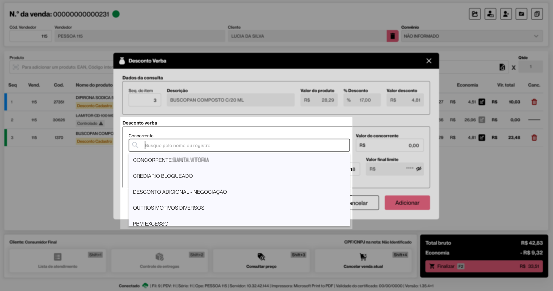 Na sequência, preencha o campo "Valor do concorrente" com o valor informado pelo cliente como referência para a concessão do desconto. Esse valor corresponde ao preço sugerido pelo cliente, podendo estar relacionado a um valor que ele afirma ter encontrado em outra loja ou a um valor que considera adequado para a compra. É aconselhável que o valor final aplicado no desconto seja menor ou igual o valor sugerido pelo cliente.
