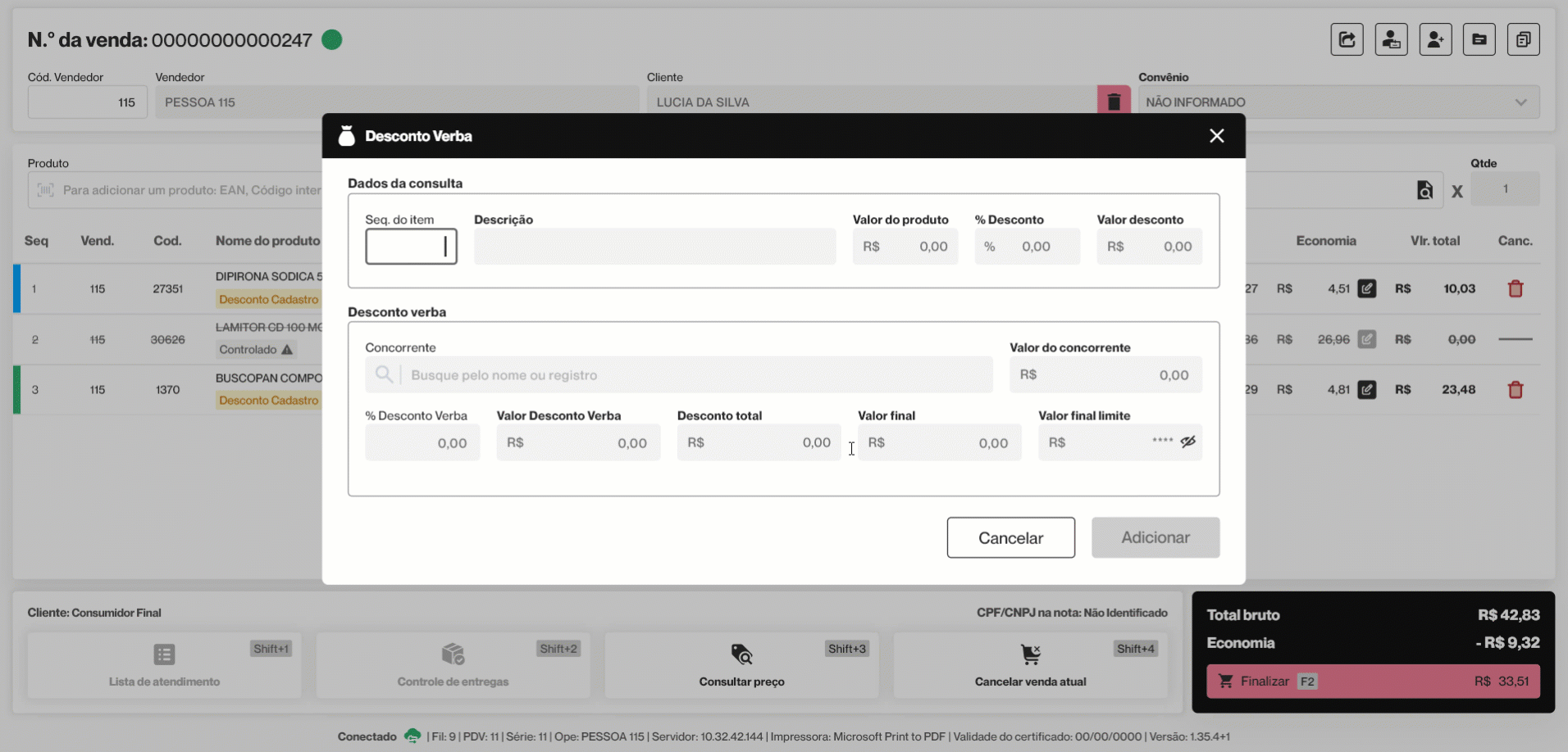 O Desconto Verba é um valor definido mensalmente para cada filial, criado para permitir descontos estratégicos em negociações específicas. Esse valor funciona como um limite disponível para que a equipe possa conceder descontos de forma controlada, sem comprometer o planejamento financeiro da empresa. Ele pode ser utilizado quando o cliente informa que encontrou o mesmo produto por um preço menor em outro estabelecimento ou apresenta um valor de referência para a compra. Nesses casos, se houver saldo disponível na verba e o operador tiver permissão, o desconto pode ser aplicado para viabilizar a venda.