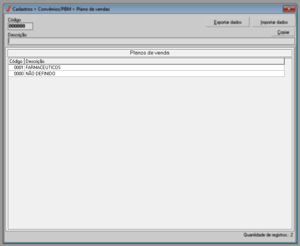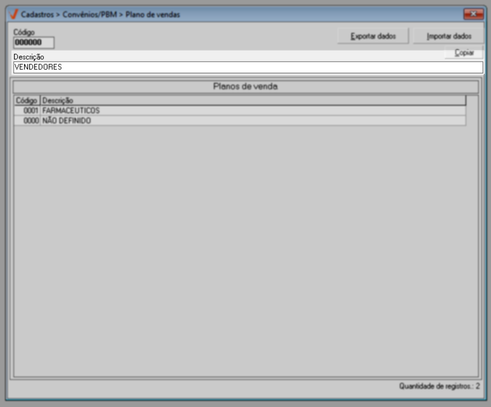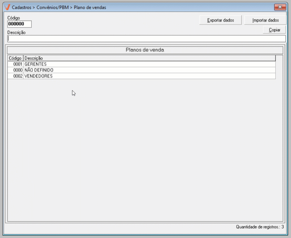 Por meio desta operação, é possível cadastrar os planos de vendas que, posteriormente, devem ser associados aos clientes conveniados. Essa associação indica a qual convênio o plano de venda está vinculado e define como suas vendas serão tratadas no momento do fechamento (Para saber como vincular o plano de venda ao cliente conveniado, clique aqui.). Além disso, o usuário deve configurar o convênio para que o fechamento financeiro seja realizado com base nesses planos de vendas, essa configuração você confere no documento Cadastro de Convênios PBM. E, se desejar saber como realizar o fechamento financeiro do convênio, clique aqui.