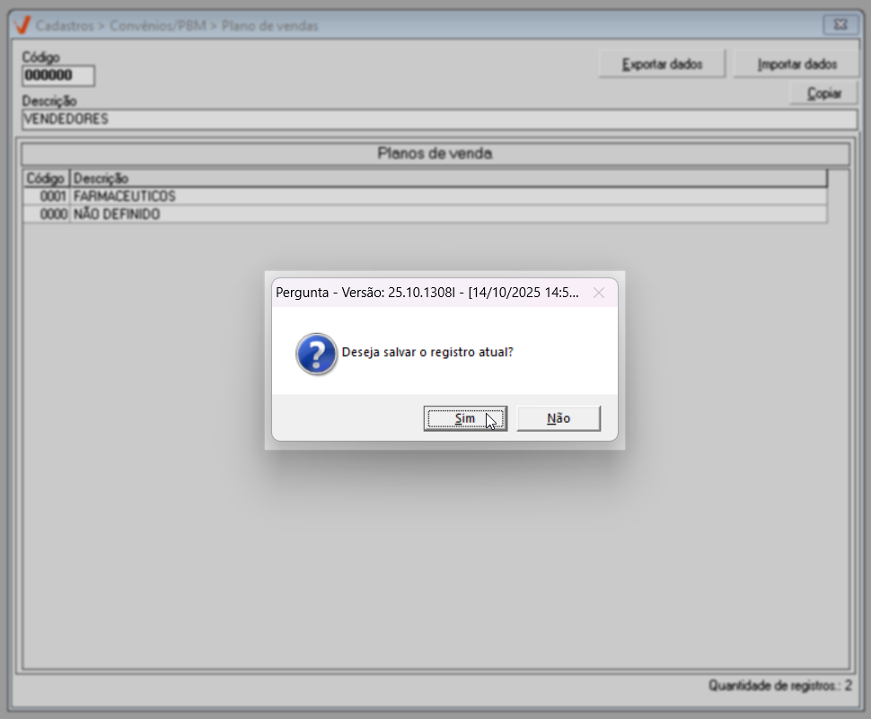 Após preencher o campo, pressione o atalho F2 para salvar o novo registro. Em seguida, o sistema solicitará a confirmação com a mensagem “Confirmar a gravação do registro?”. Clique em "Sim" para concluir a operação.
