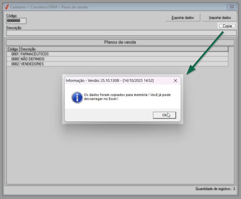 Com o objetivo de facilitar a replicação ou adesão das origens de venda em novos ambientes, o sistema oferece as opções de "Exportar" e "Importar Dados". Ao acionar a opção >> Exportar, será gerado um arquivo contendo os dados do plano, que será salvo localmente na máquina. Por padrão, o caminho costuma ser C:\Users\Temp. Uma janela será exibida com a mensagem "Caminho do arquivo copiado para a memória"; ao clicar em "Ok", o caminho será automaticamente copiado para a área de transferência.