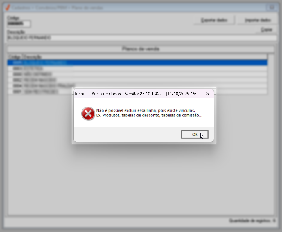 Se for necessário excluir um plano, selecione o registro, pressione F5 e confirme a exclusão.