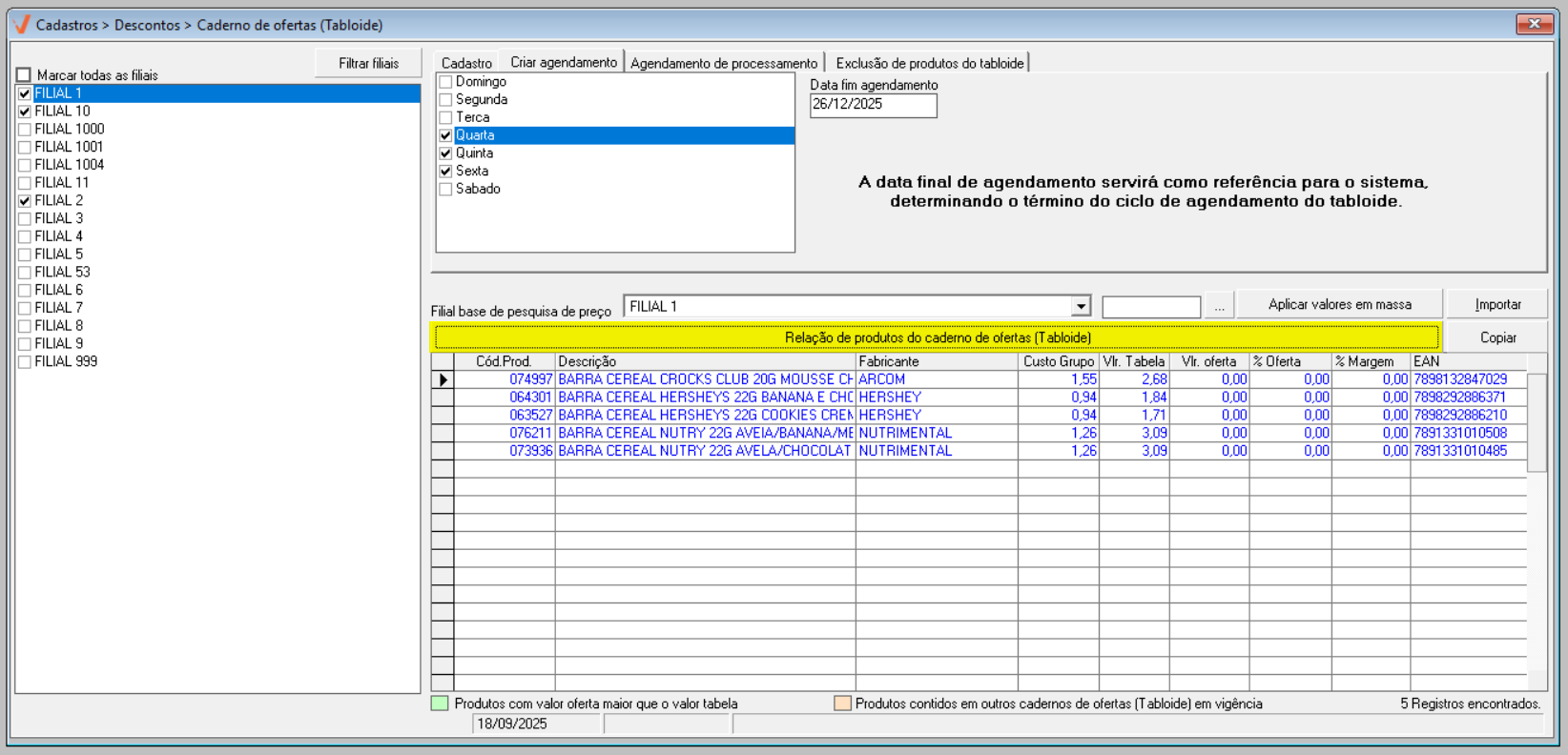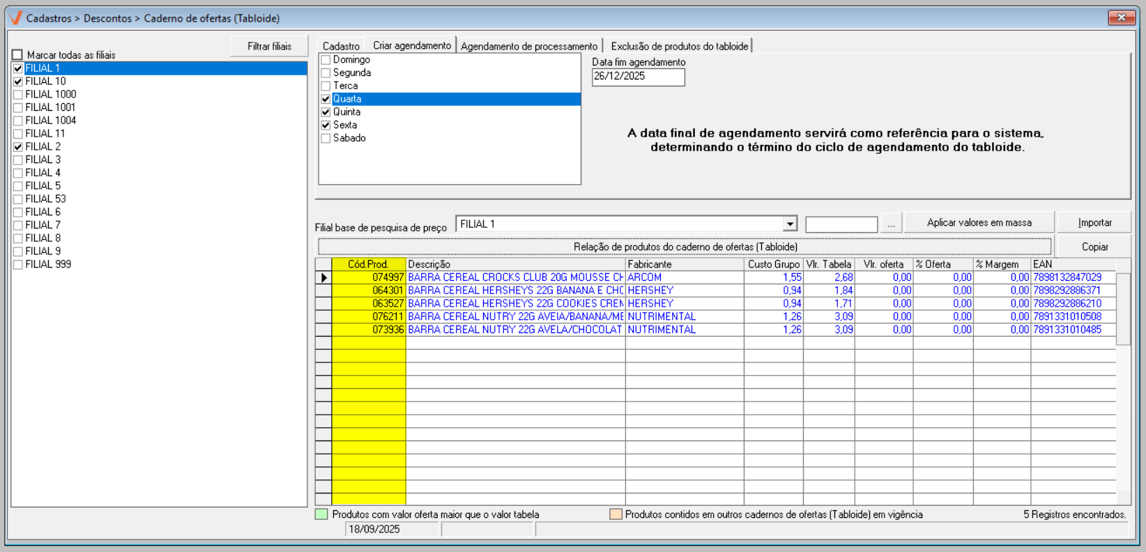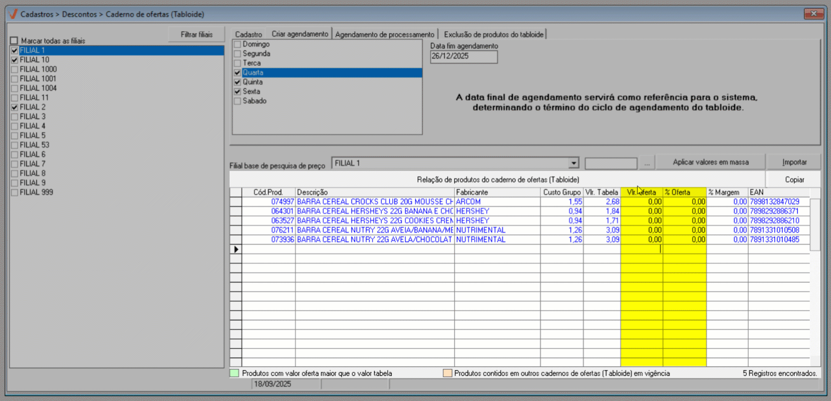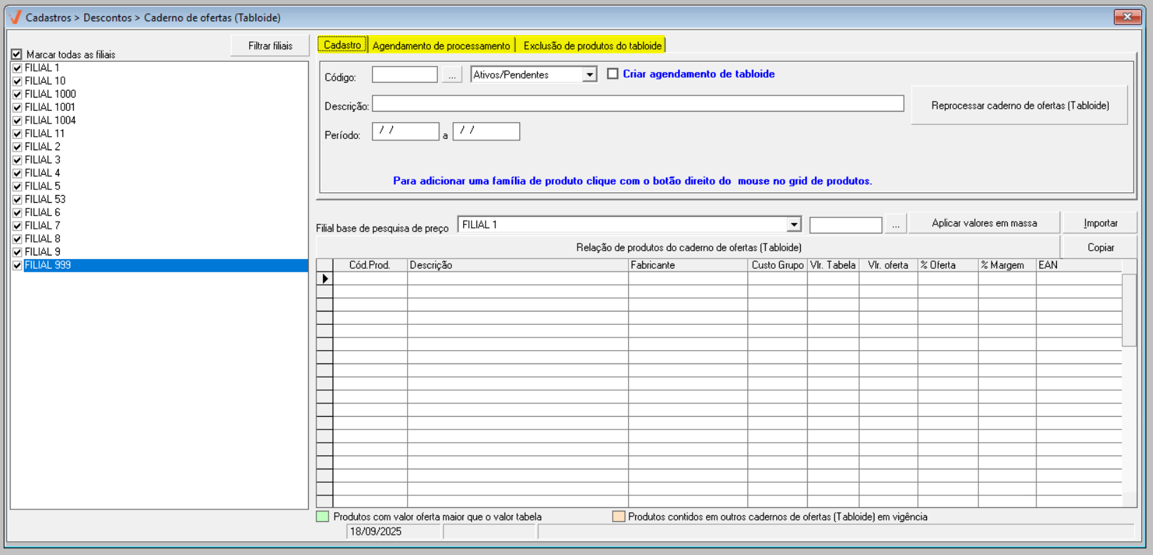 - Acesse o menu: Cadastros >> Descontos >> Caderno de Ofertas (Tabloide).