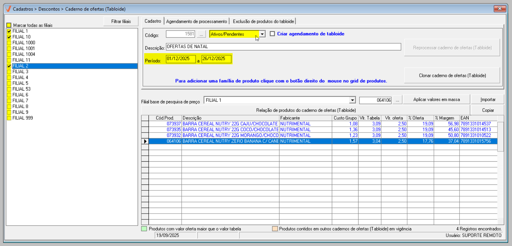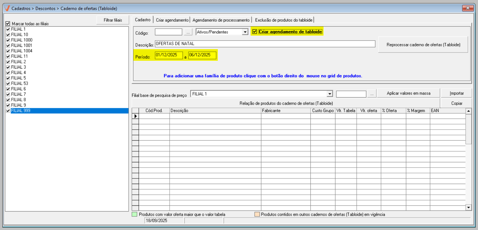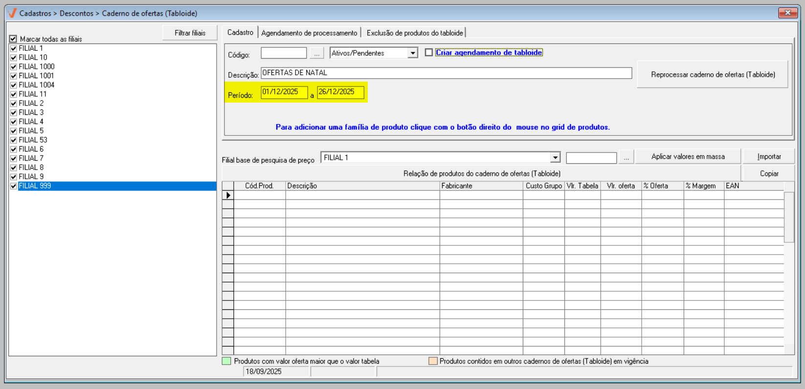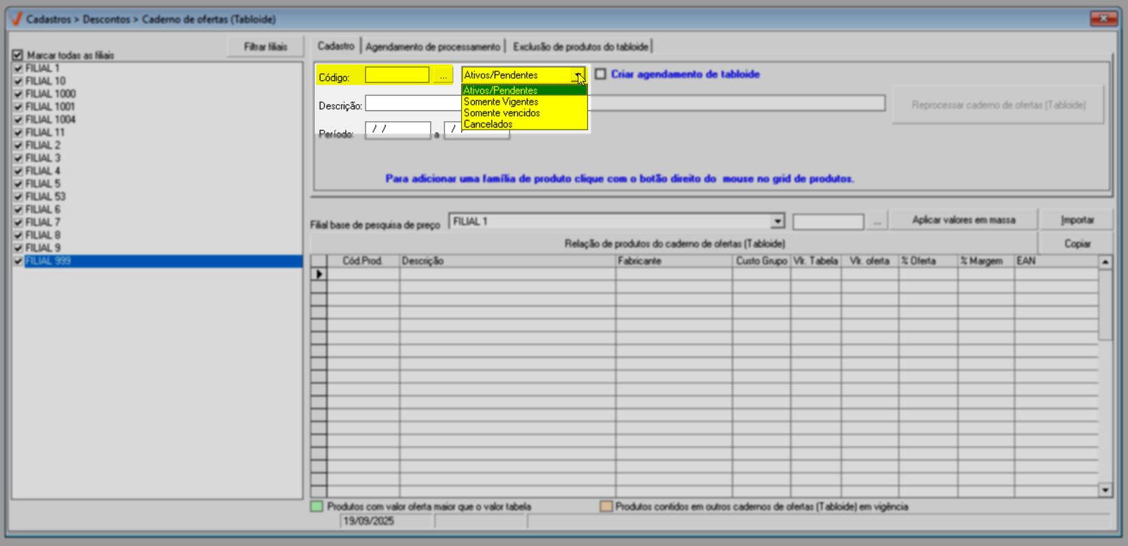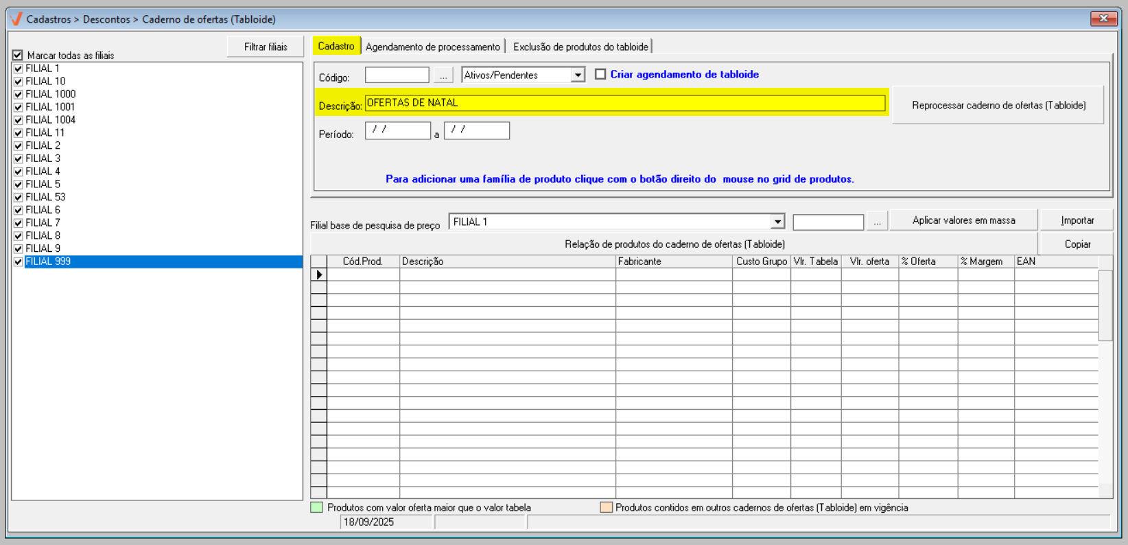 Para cadastrar um caderno de oferta, é necessário clicar na aba "Cadastro", onde será feita a configuração do caderno de ofertas, incluindo a seleção dos produtos e das lojas participantes. No campo "Descrição", insira um nome para o tabloide. É recomendável utilizar o nome da campanha, como por exemplo, "Ofertas de Natal", isso facilita a identificação e a organização dos registros.