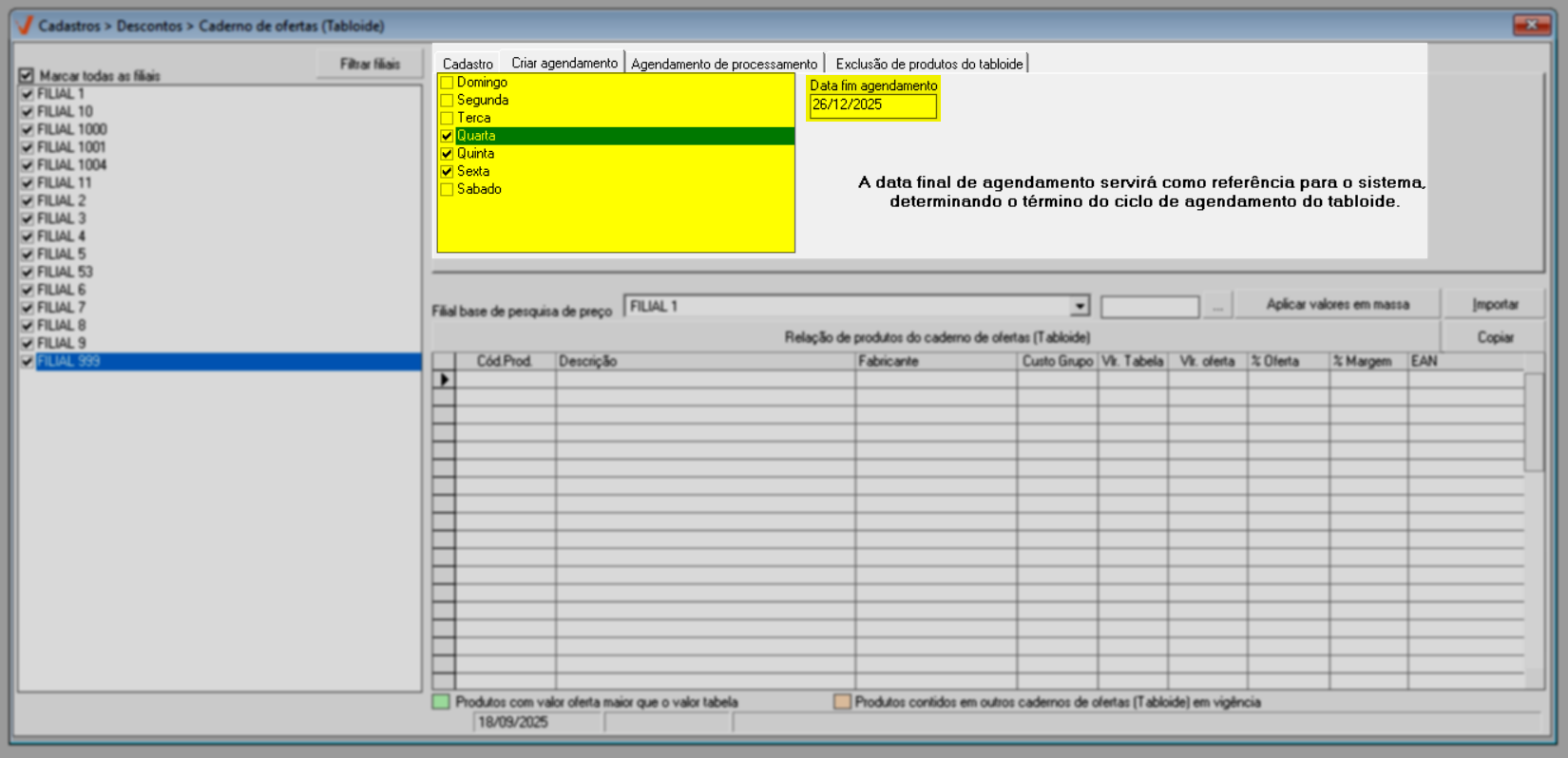 A seguir, o próximo passo será definir as datas de validade para o caderno de ofertas. O sistema oferece duas opções: Pode-se definir uma data inicial e final na seção "Período", ou pode-se optar por criar um agendamento para o tabloide, ao marcar a opção - "Criar agendamento de tabloide", especificando quais dias da semana ele estará em vigor e, ao mesmo tempo, estabelecendo uma data de término para esse agendamento.