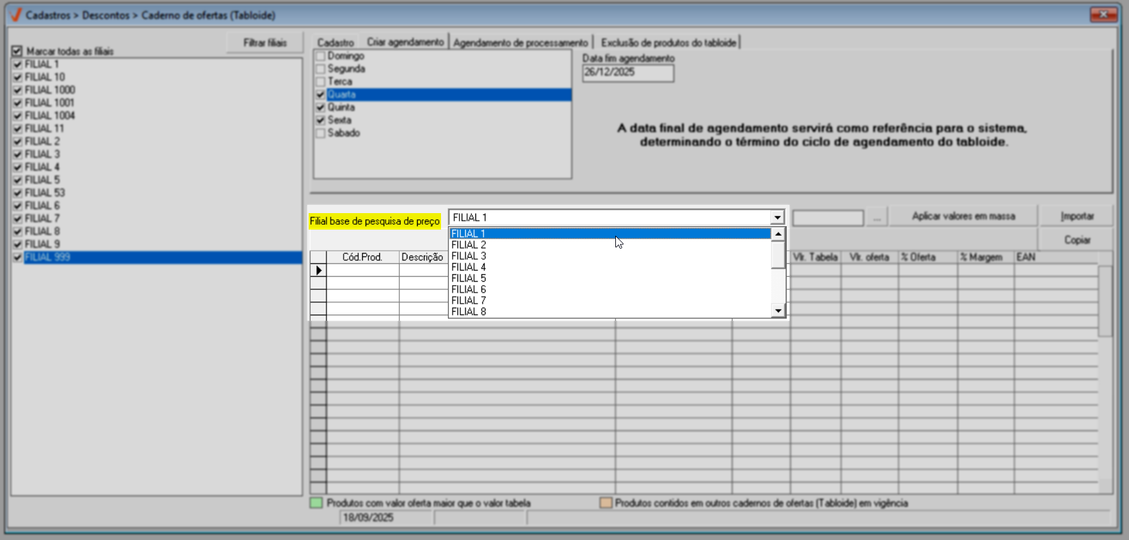 Com isso, a aba "Criar agendamento" será exibida automaticamente. Nela, o usuário poderá escolher no quadro à esquerda os "dias da semana" em que o caderno de ofertas estará disponível e indicar à direita no campo "data fim agendamento" qual data será considerada para o encerramento do agendamento, ou seja, a data em que o caderno de ofertas deixará de estar vigente. Clique aqui para entender como continuar o cadastro.