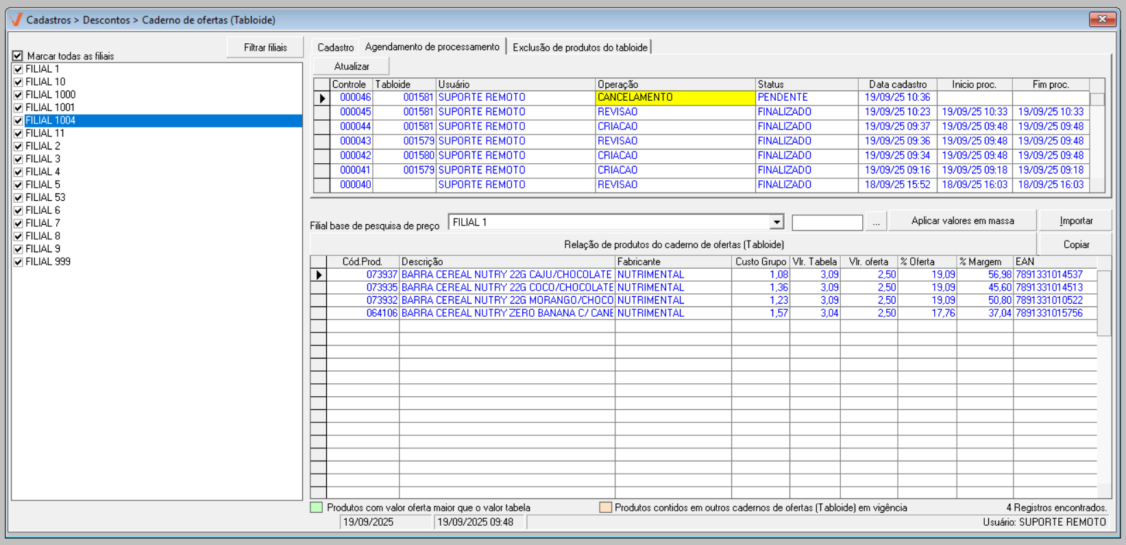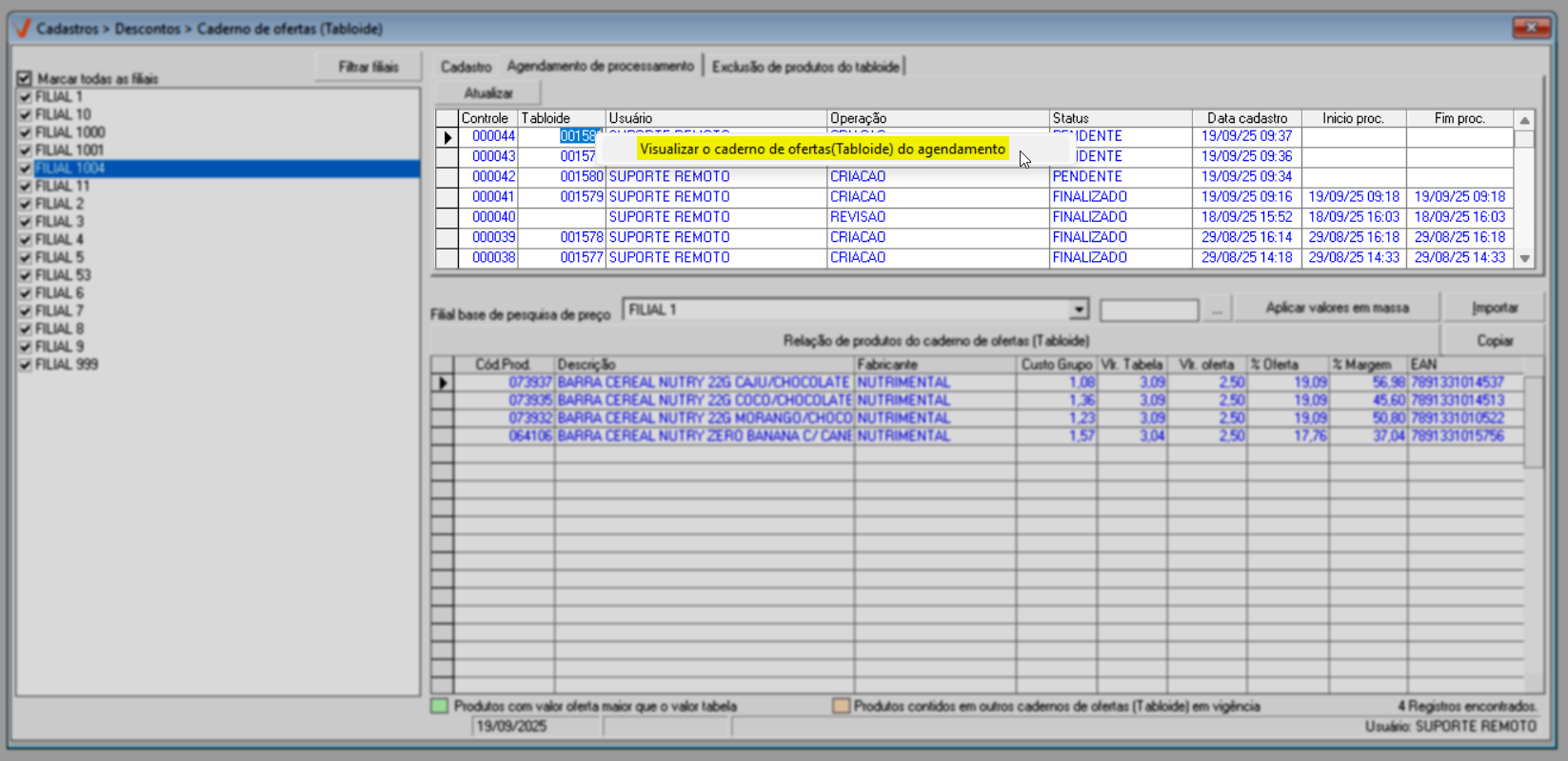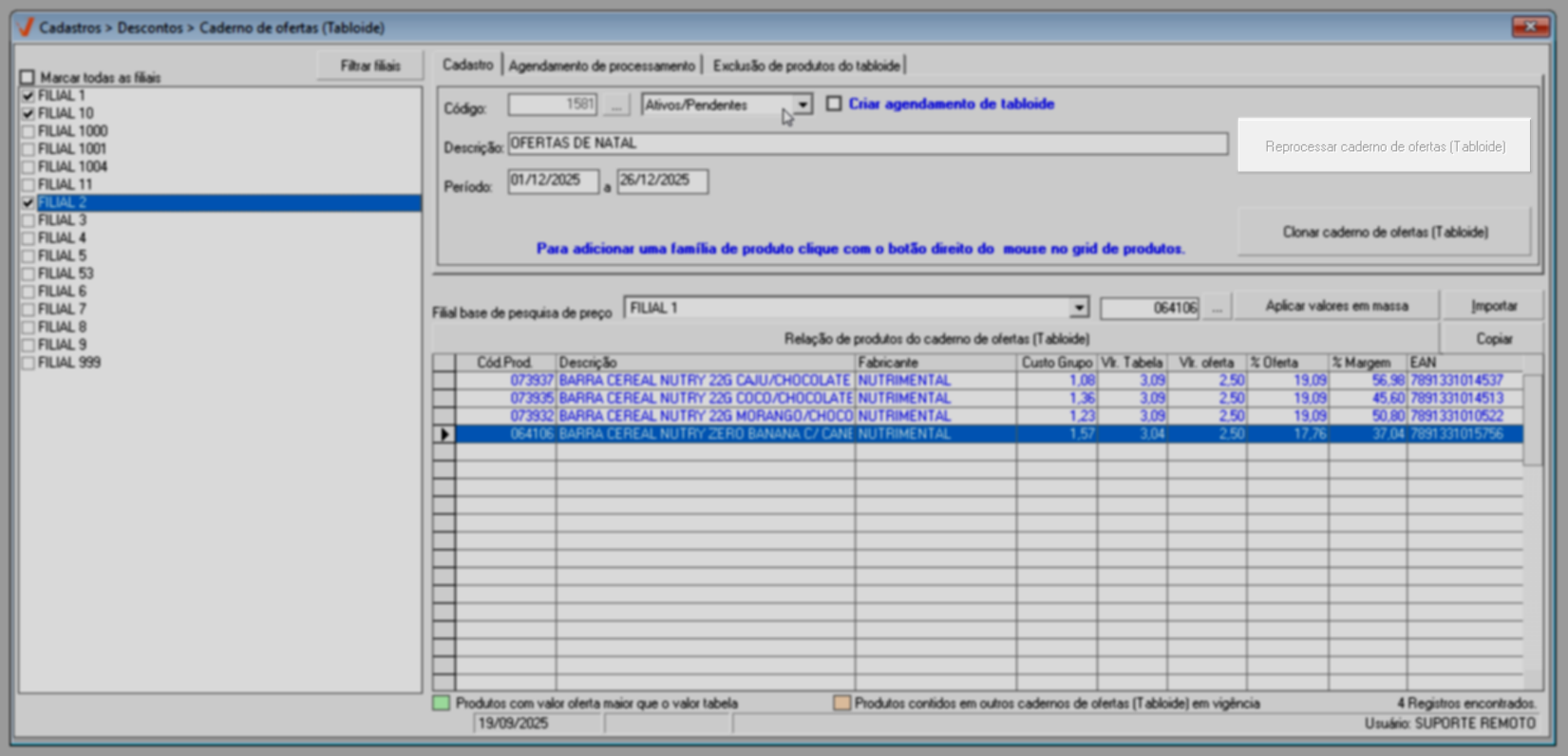 - Consulta, Reprocessamento, Clonagem, Cancelar e Prolongamento de Tabloides: Neste passo, o usuário aprenderá a consultar cadernos de ofertas previamente cadastrados, executar o reprocessamento (ou seja, revisar todas as configurações aplicadas ao caderno de ofertas), e estender a validade do caderno de ofertas atual, desde que ele esteja ativo, vigente ou próximo do vencimento.