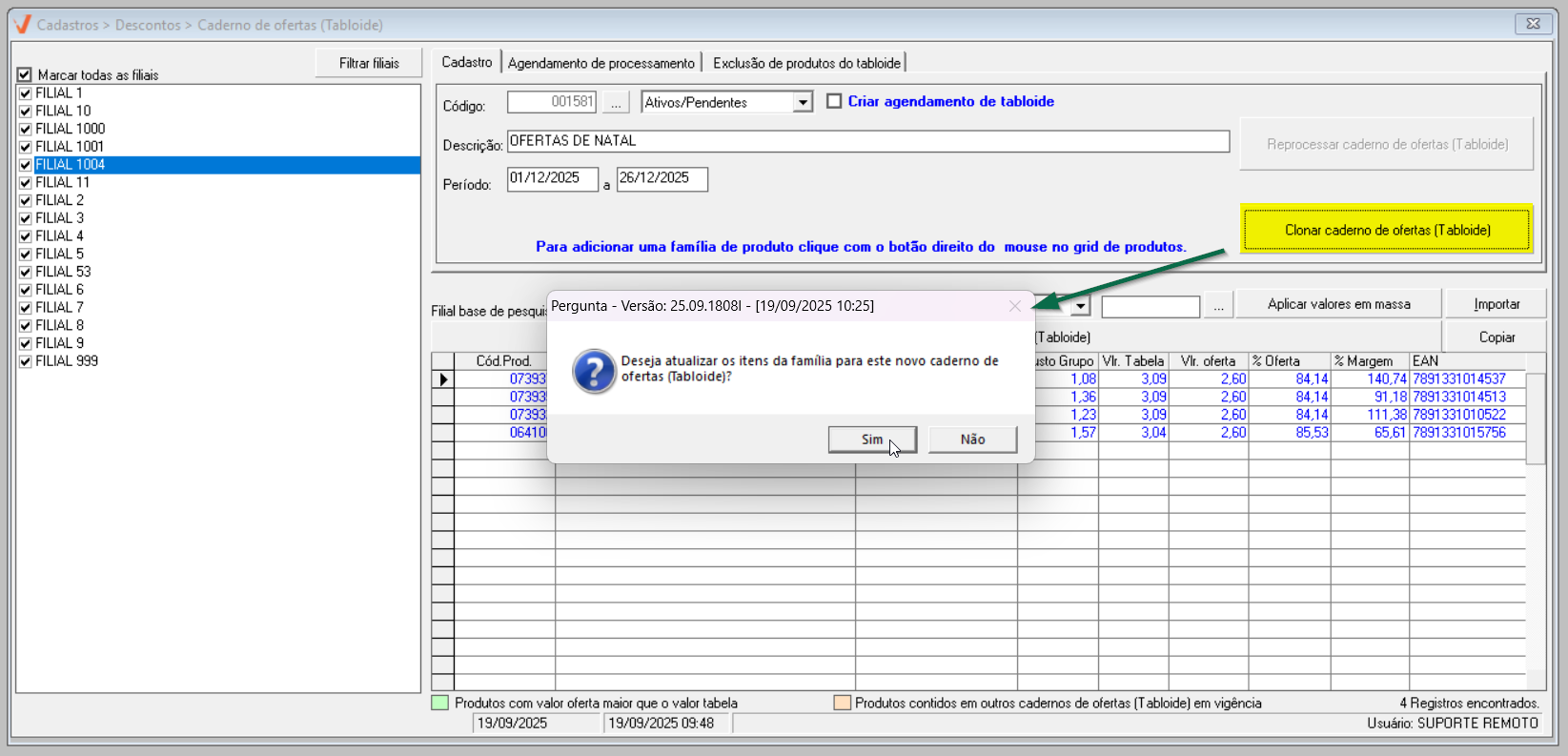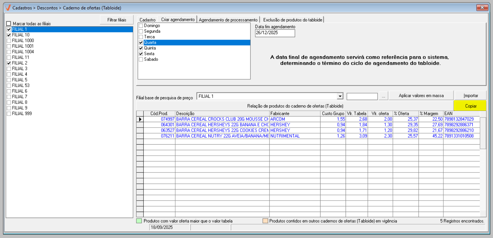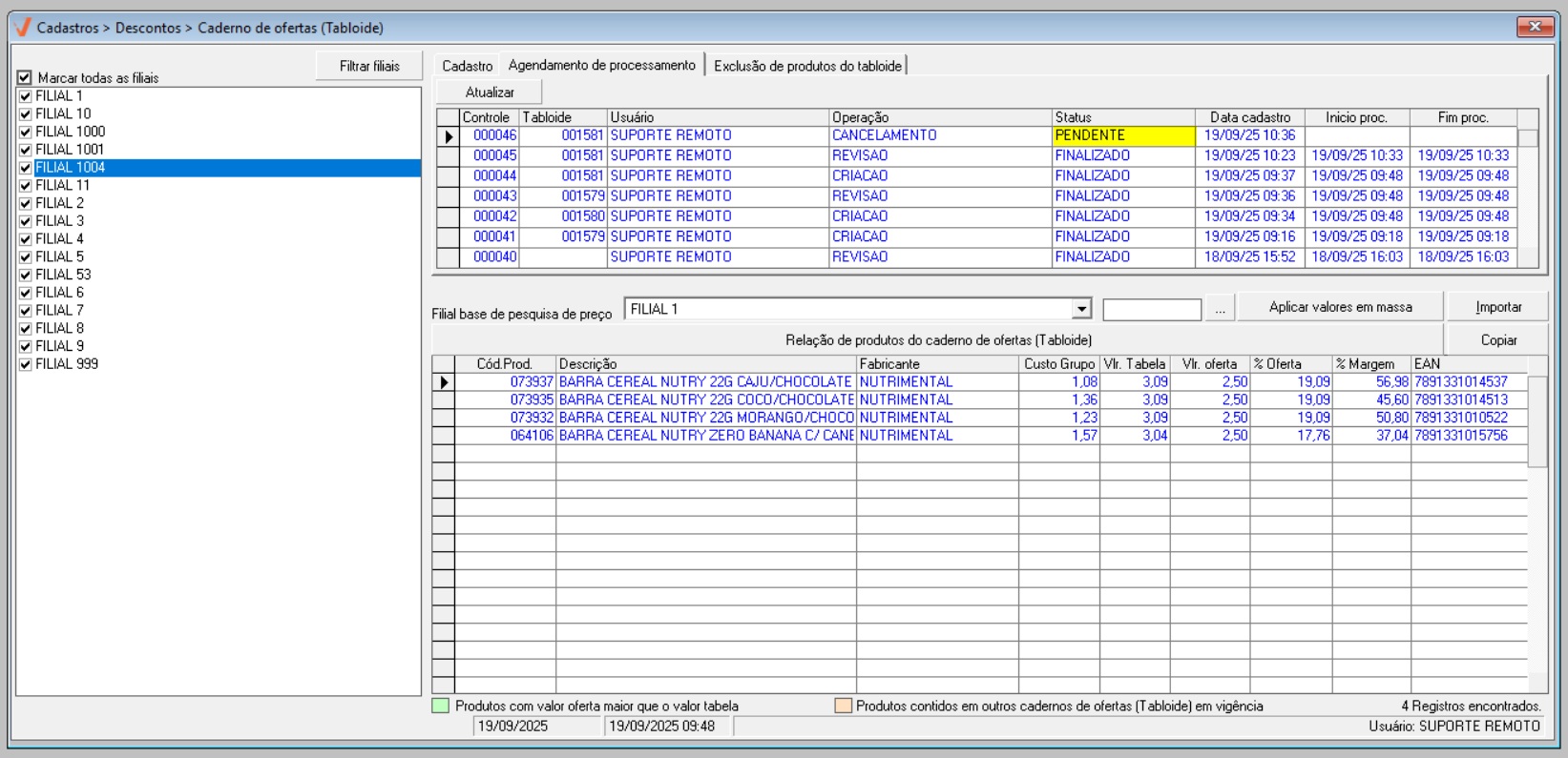 - Consulta, Reprocessamento, Clonagem, Cancelar e Prolongamento de Tabloides: Neste passo, o usuário aprenderá a consultar cadernos de ofertas previamente cadastrados, executar o reprocessamento (ou seja, revisar todas as configurações aplicadas ao caderno de ofertas), e estender a validade do caderno de ofertas atual, desde que ele esteja ativo, vigente ou próximo do vencimento.