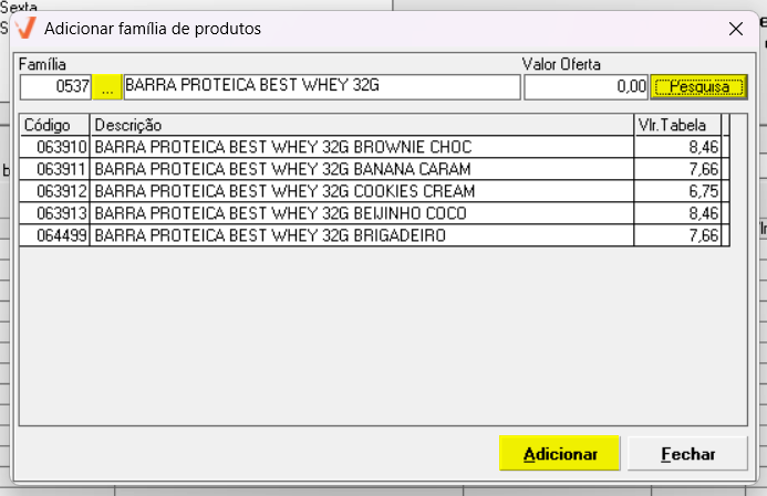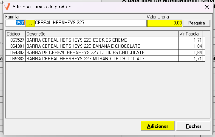 Pesquisar por uma família de produtos: Por meio desta opção, o usuário conseguirá localizar e adicionar uma determinada família de produtos à relação. Além disso, indicar se necessário o seu valor de oferta, em seguida para incluir os registros na relação do tabloide basta clicar em >> Adicionar.
