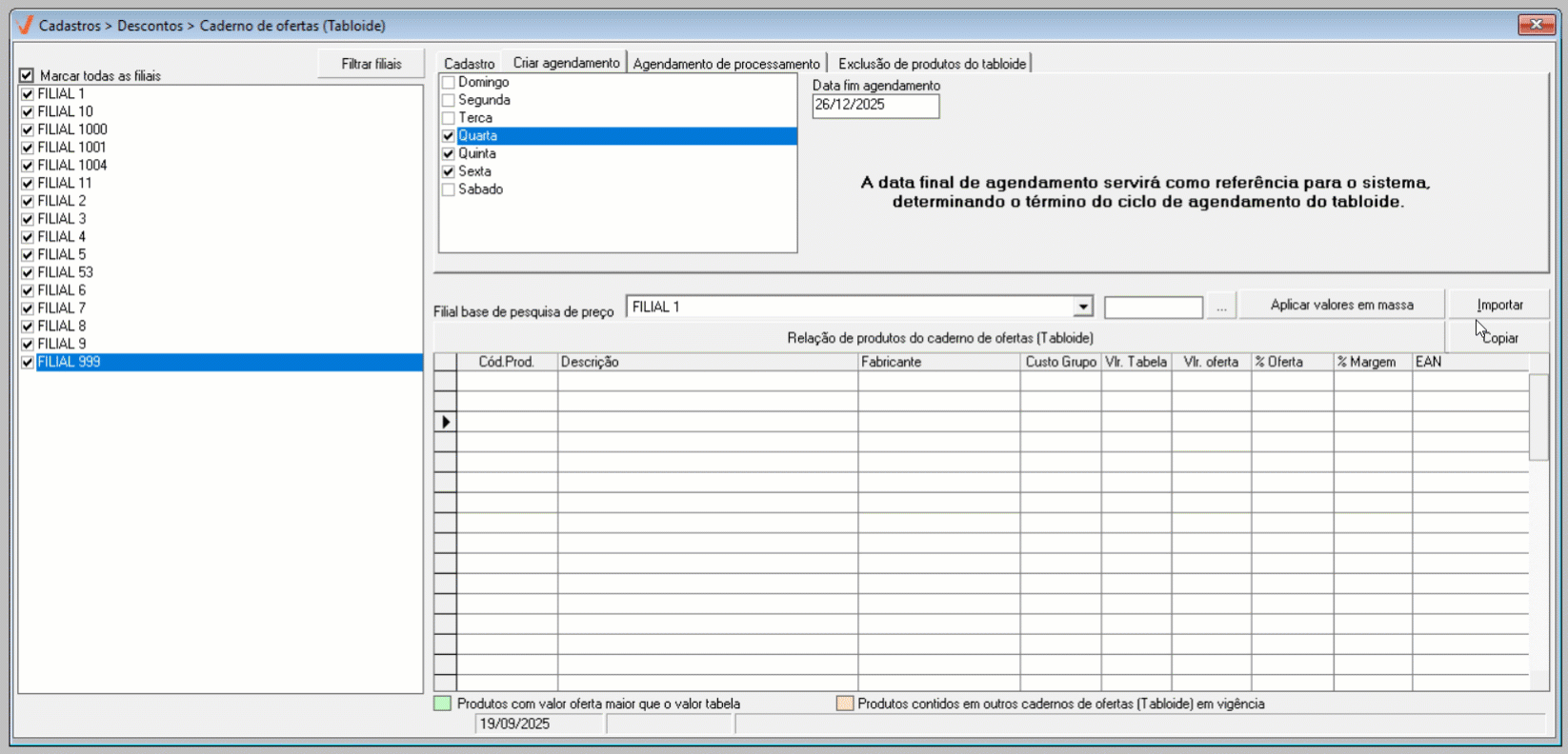 Para utilizar este tipo de programação, marque a opção "Criar agendamento de tabloide" e utilize a seção "Período" para informar as datas inicial e final para a vigência do caderno de ofertas.