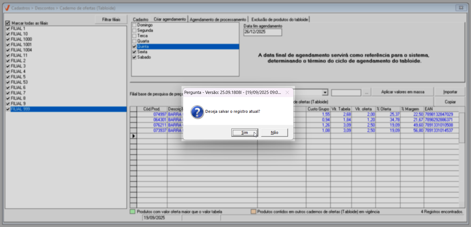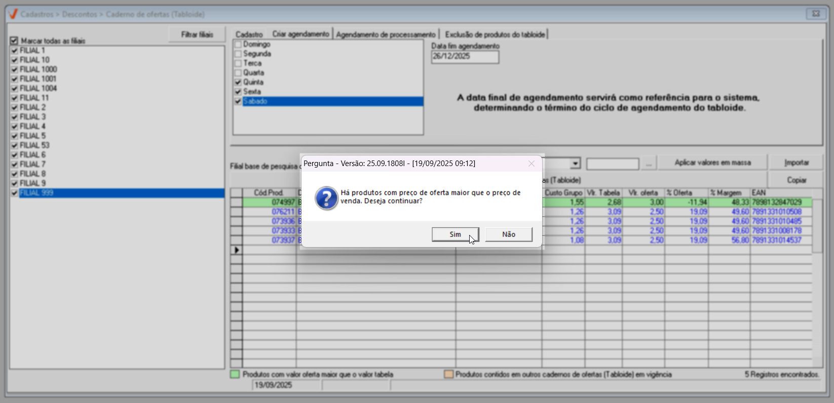 Ao clicar no atalho F2 para salvar o cadastro, caso haja produtos com o preço de oferta maior que o preço de venda, será exibido um alerta. Veja: