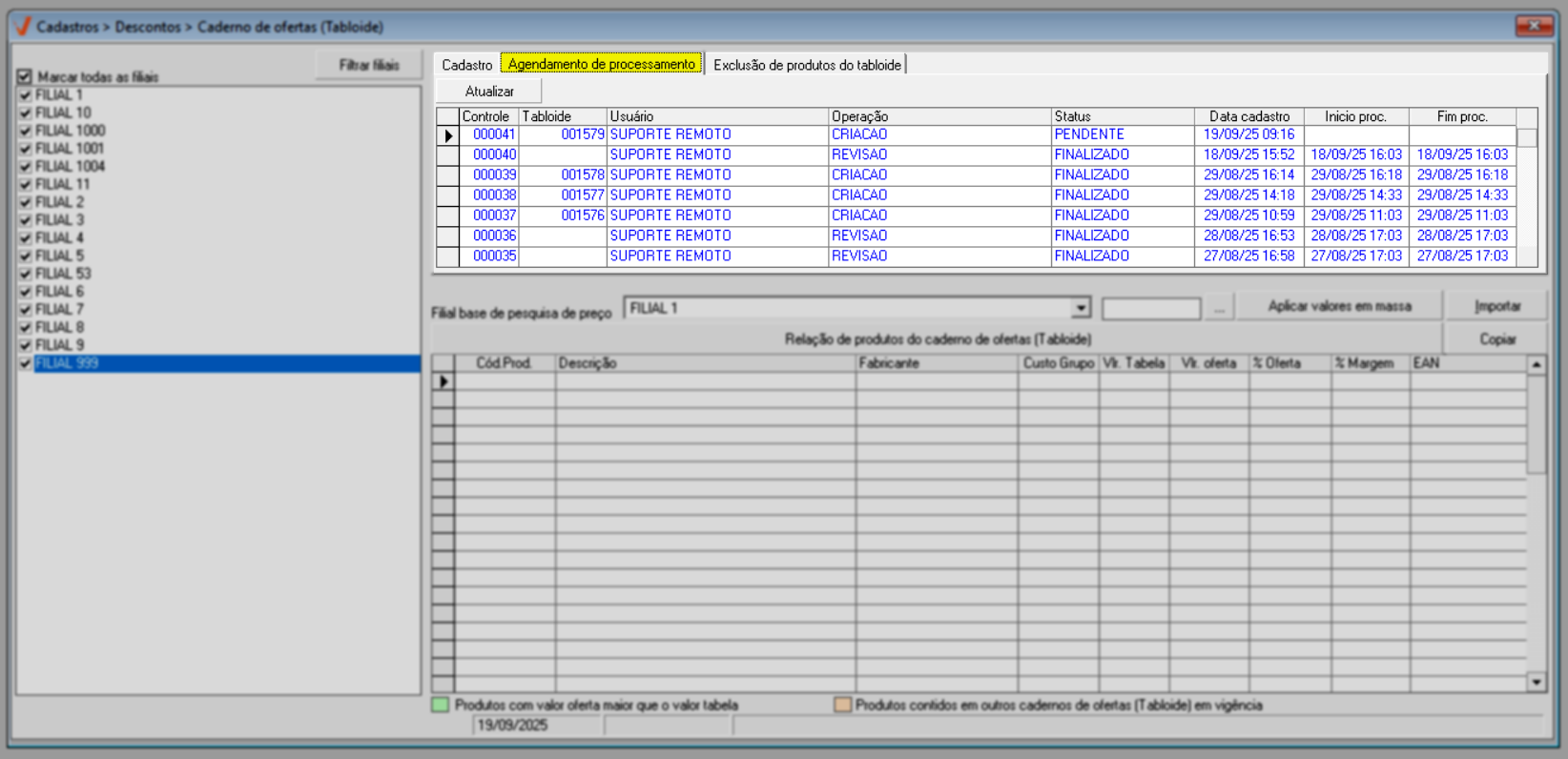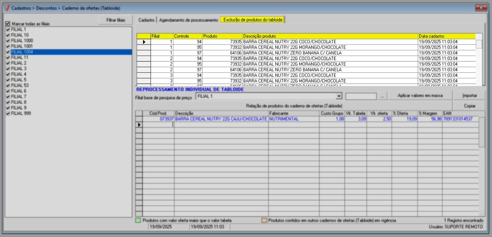 Essas informações ficam disponíveis na aba “Exclusão de produtos do tabloide”, onde podem ser visualizados dados como: filial, controle (sequência numérica gerada automaticamente pelo sistema), código do produto, descrição do produto, além da data e hora da exclusão.