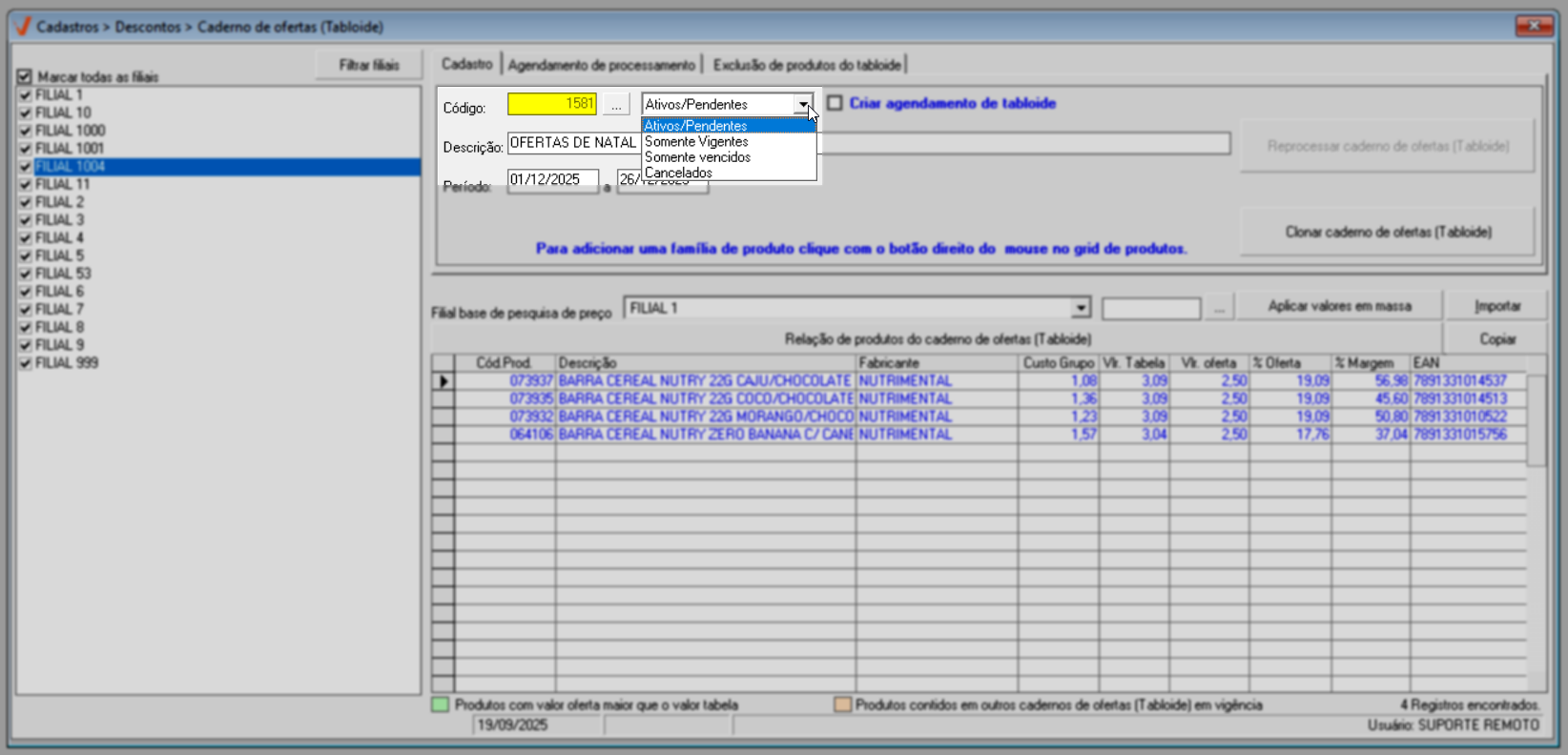 - Ativos/Pendentes: Caderno de oferta ativo, mas não vigente, ou seja, a vigência será iniciada um dia após à data de início informada, exemplo: Data de início em 01/03/2025 a vigência iniciará em 02/03/2025. Mas, o usuário poderá reprocessar o tabloide para antecipar sua vigência. Clique aqui e aprenda como realizar esta operação.