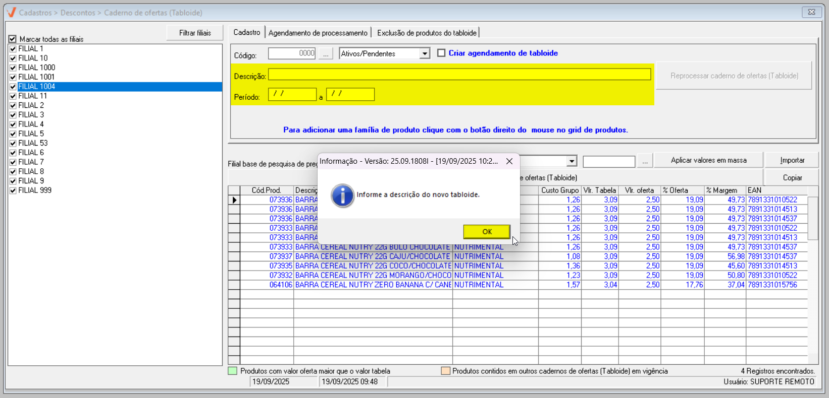 A seguir, será apresentado o alerta "Informe a descrição do novo tabloide", clique em >> Ok para prosseguir.