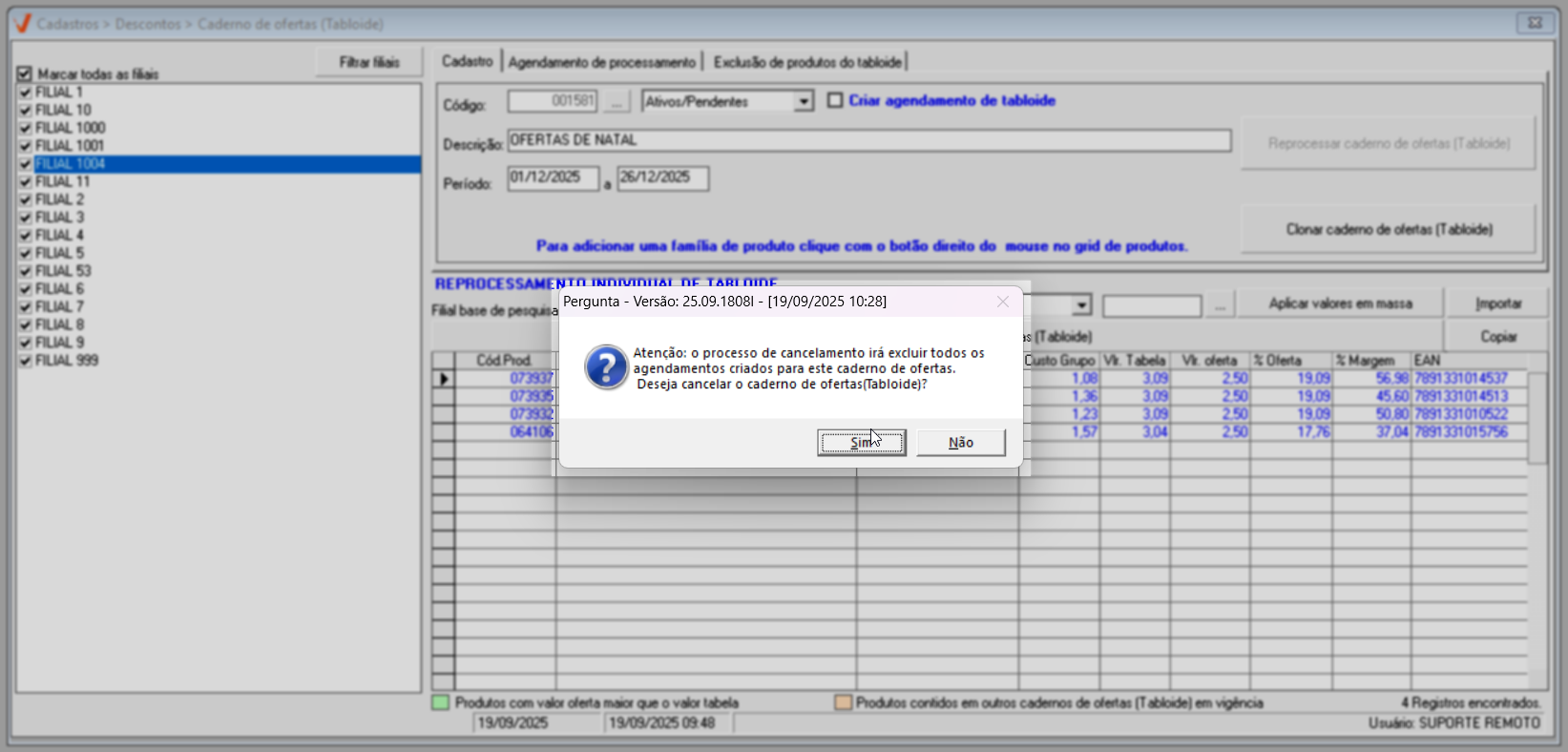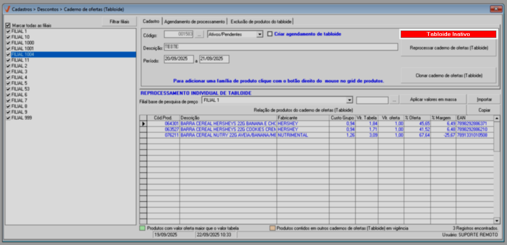 - Também será possível incluir ou remover filiais vinculadas a um tabloide desde que o mesmo não esteja vencido e/ou cancelado: