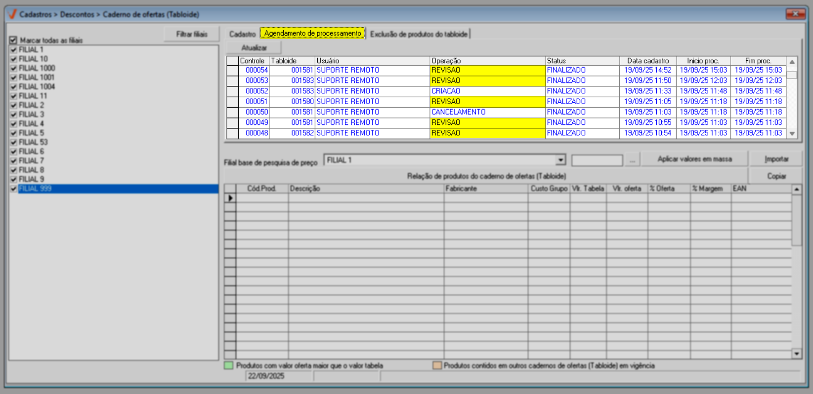 E para fins de auditoria, ao detalhar um caderno de ofertas com o processamento “Revisado” (ou seja, um registro previamente salvo e alterado), através da aba "Agendamento de processamento", é possível identificar, quando houver, os produtos que foram excluídos.