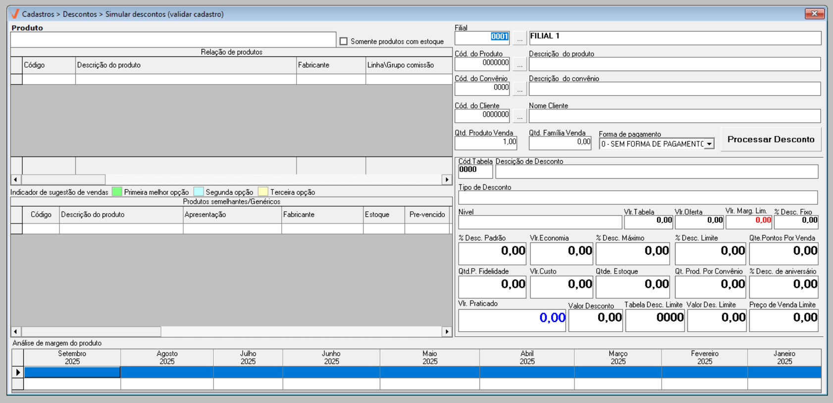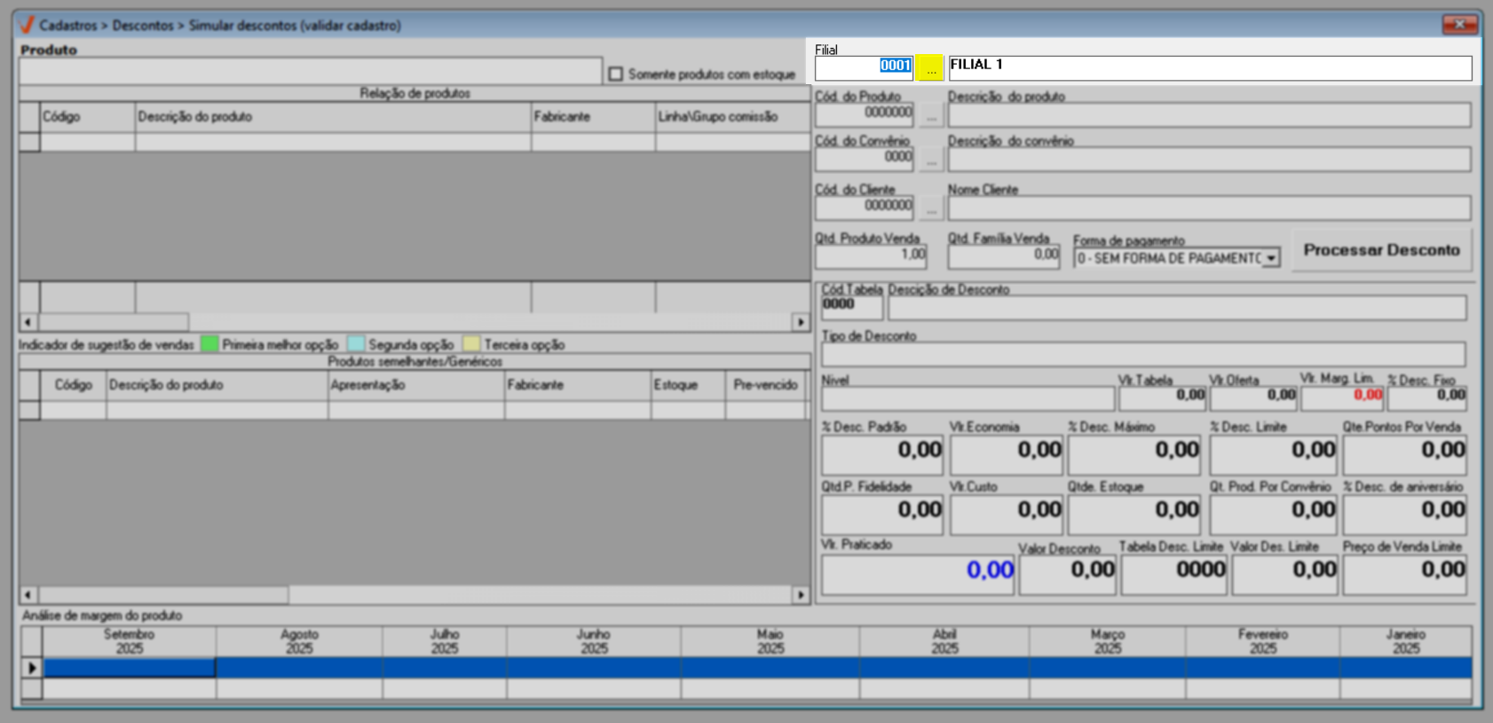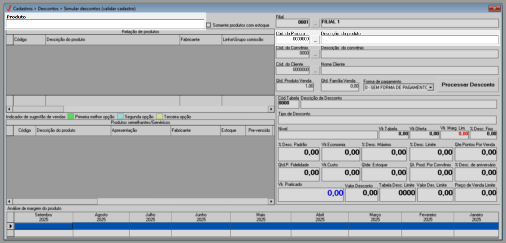 Se o foco for apenas simular descontos para um item exato, informe o código do produto no campo “Cód. produto” e pressione >> Enter. O sistema carregará automaticamente a descrição no campo ao lado e, quando houver, exibirá os detalhes dos cálculos de desconto, considerando a melhor condição disponível conforme o cadastro do produto, permitindo que o usuário avance diretamente para a simulação. Caso não existam modalidades de desconto cadastradas para o item, serão apresentados apenas os campos que exibem os valores padrão do produto. Também é exibida na parte inferior da tela, a análise de margem do produto, referente aos meses anteriores ao atual, servindo como apoio para o monitoramento de desempenho. Já a seção à direita não exibirá nenhuma informação.