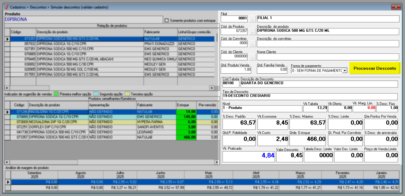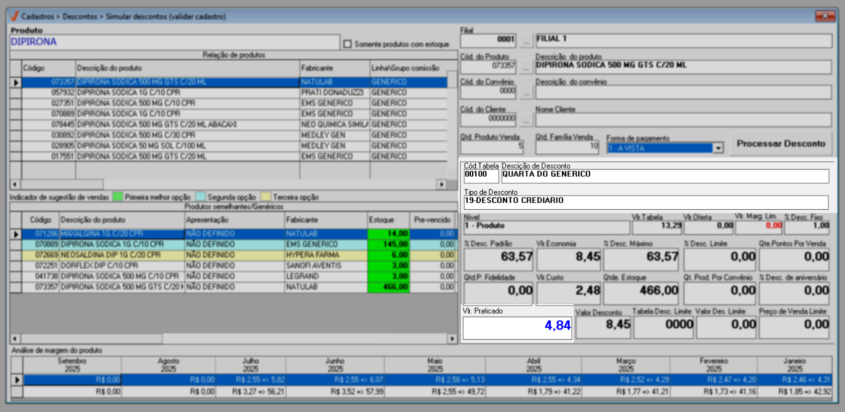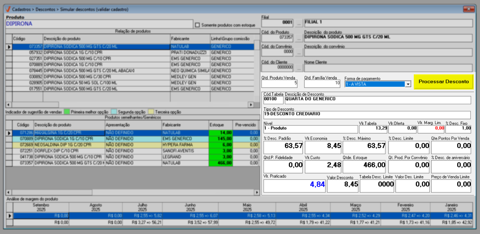 Como esta tela é utilizada para simular e analisar os descontos aplicados ao produto, e não para fazer alterações, sugerimos que utilize a tela de "Alteração de preço de venda/descontos de medicamentos pela margem", caso deseje efetuar algum ajuste na precificação do produto.