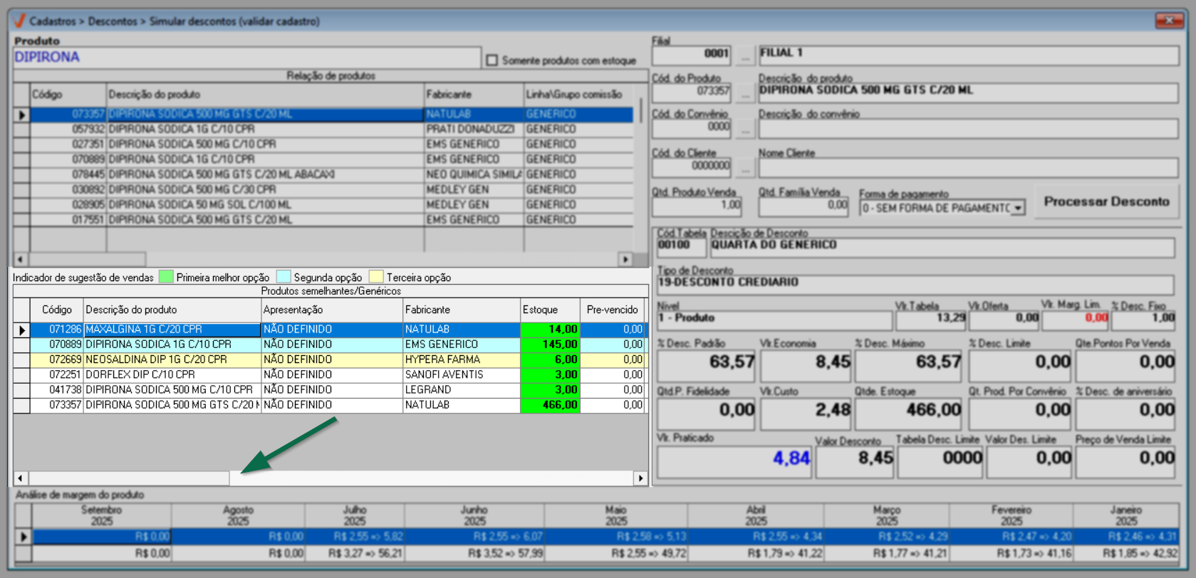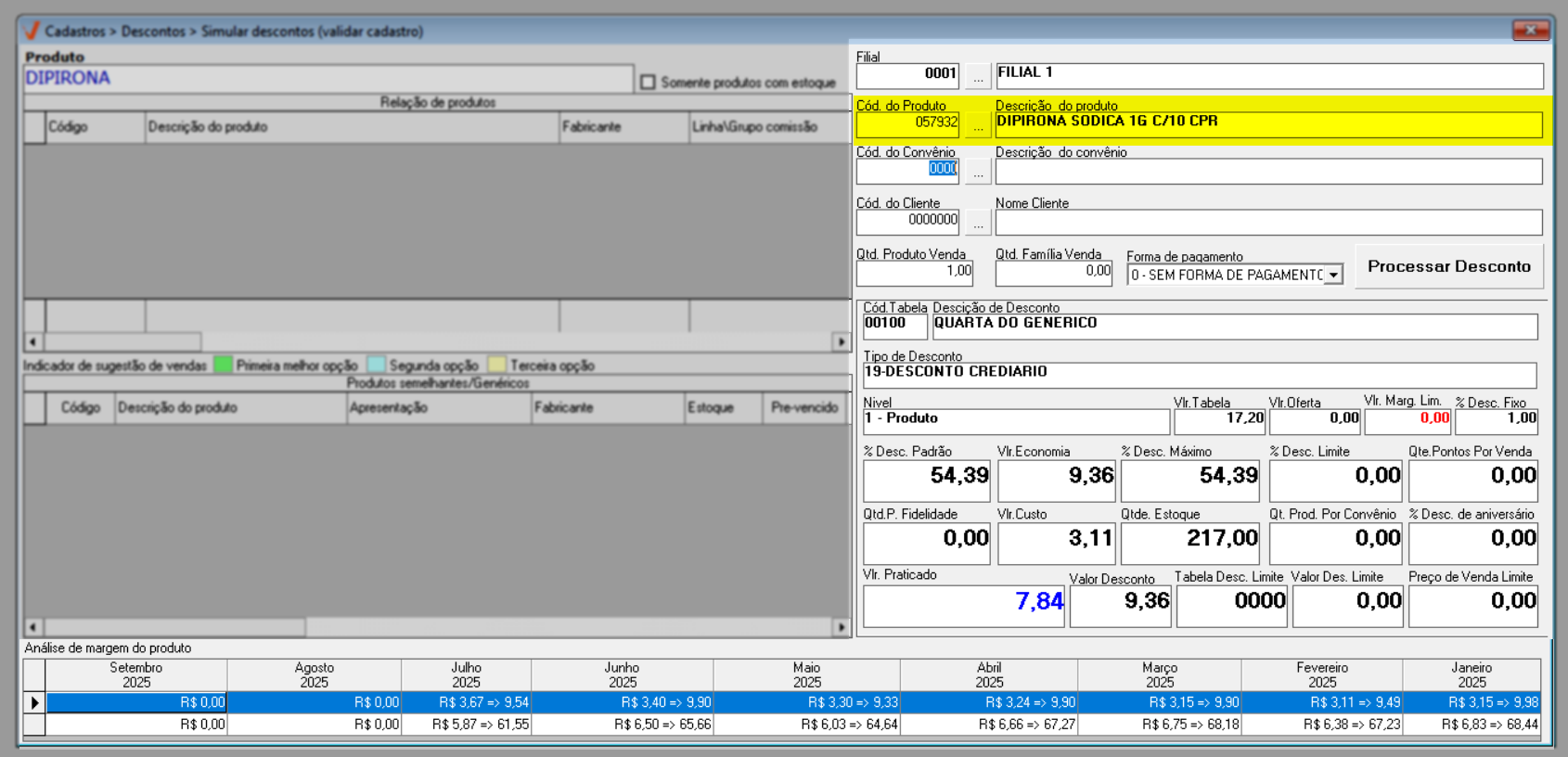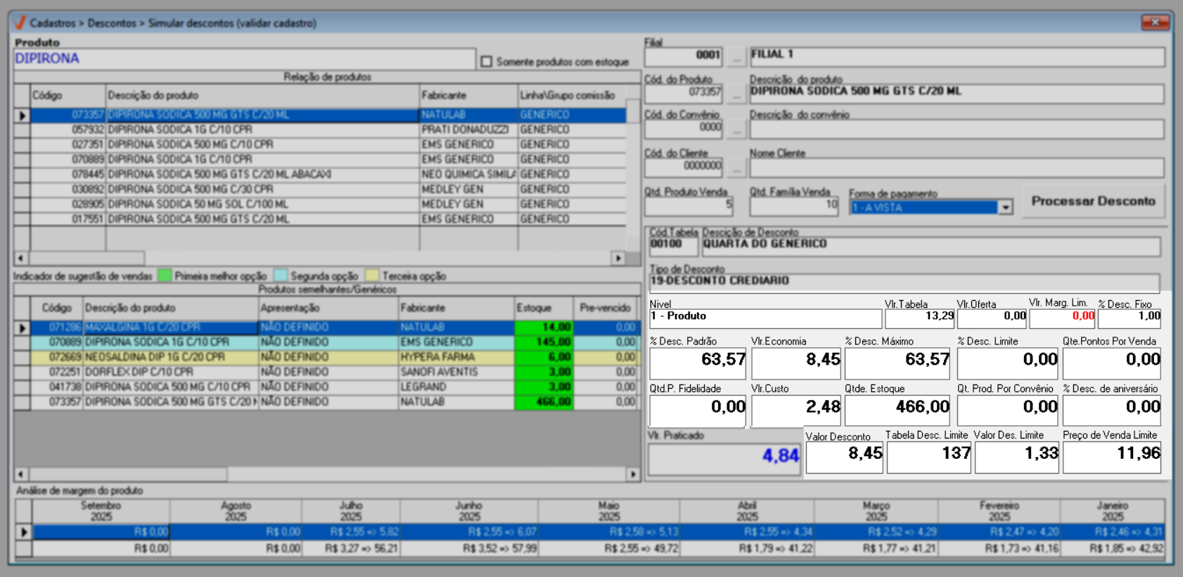 Como esta tela é utilizada para simular e analisar os descontos aplicados ao produto, e não para fazer alterações, sugerimos que utilize a tela de "Alteração de preço de venda/descontos de medicamentos pela margem", caso deseje efetuar algum ajuste na precificação do produto.