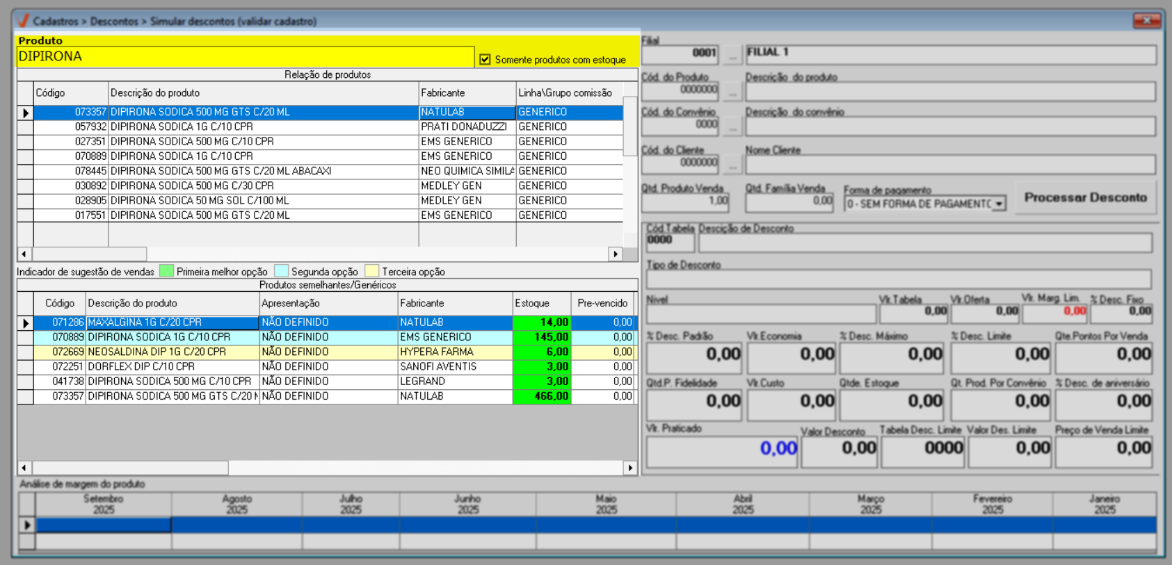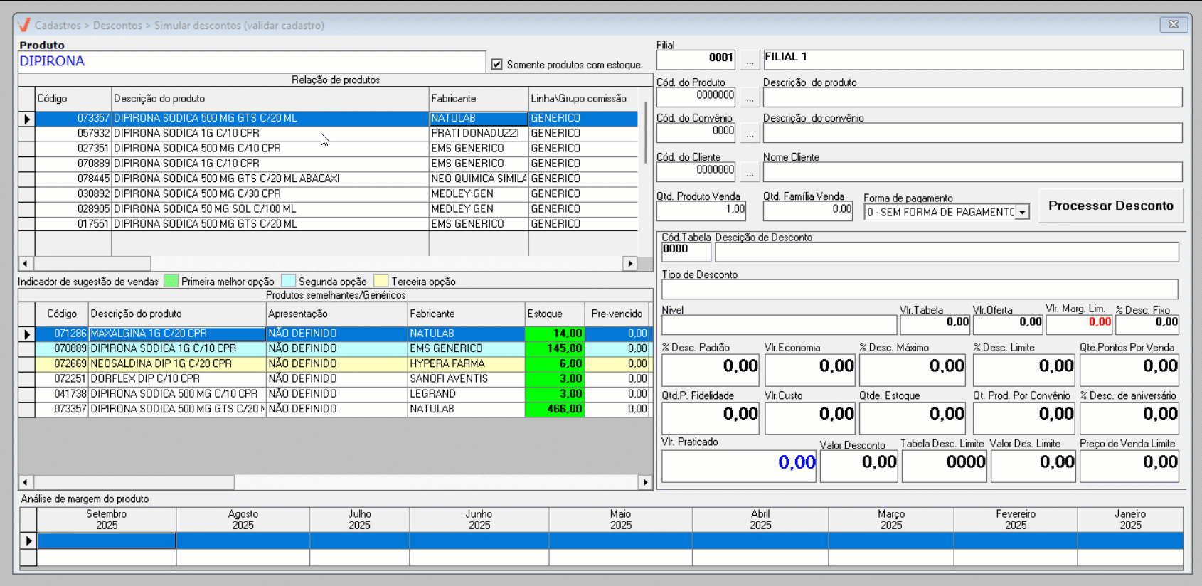 Na seção “Relação de produtos”, o usuário pode visualizar todos os itens retornados pela pesquisa, analisando informações como código e descrição do produto, fabricante e linha ou grupo de comissão ao qual pertencem. Para consultar as melhores sugestões de venda ou realizar a simulação de descontos, basta clicar duas vezes sobre o produto desejado. Ao fazer isso, caso existam dados disponíveis, as seções “Produtos semelhantes/genéricos”, “Análise de margem de lucro” e “Simulação de descontos” serão automaticamente atualizadas com as informações correspondentes.