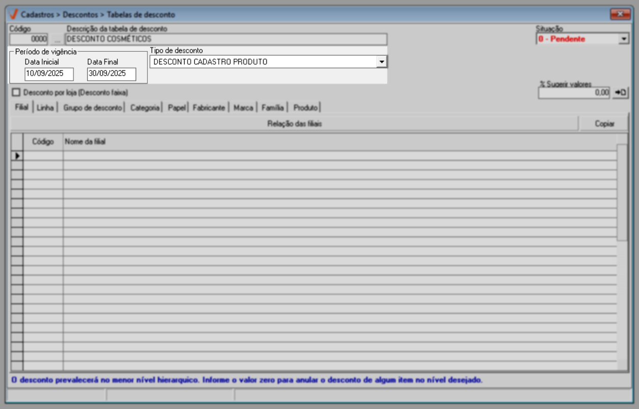 - Finalizado: A tabela de desconto está desativada e não está em uso no sistema, independentemente do seu prazo de vigência.