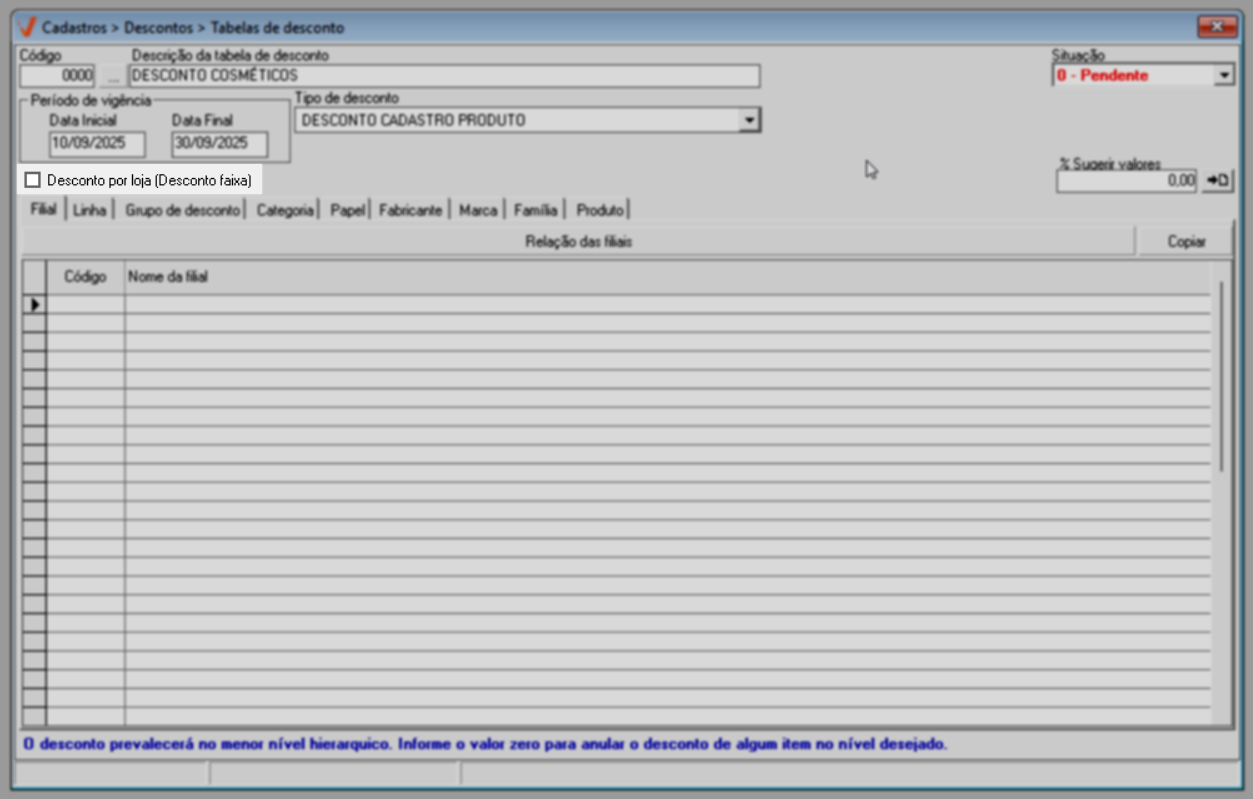 É importante destacar que caso tenha realizado a marcação da opção “Desconto por loja (desconto faixa), é essencial informar apenas uma filial. Se mais de uma filial for vinculada à mesma tabela, não será possível aplicar o desconto faixa.