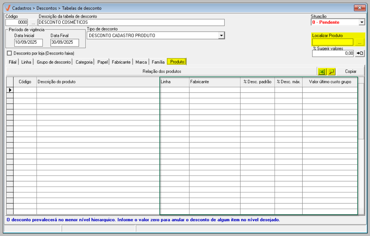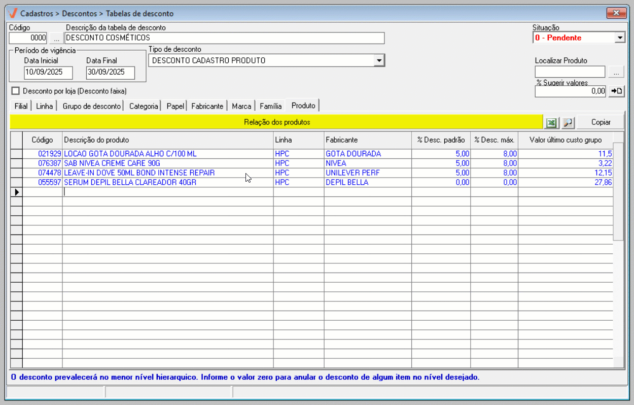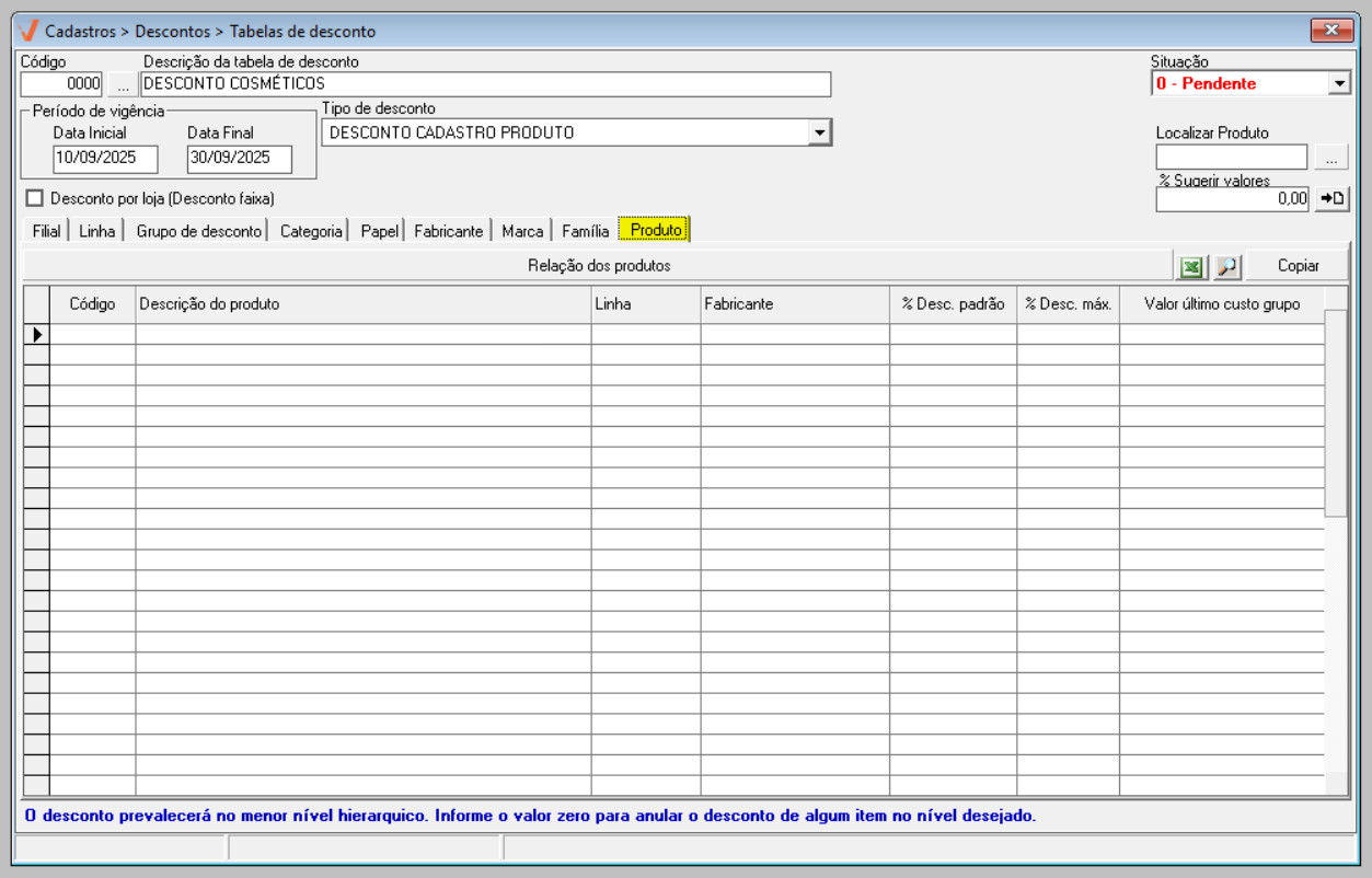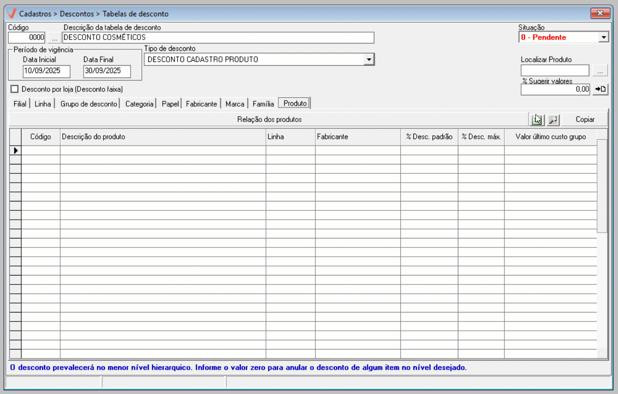 - Para realizar o cadastro de uma tabela de descontos é necessário que os produtos estejam previamente cadastrados no sistema.
