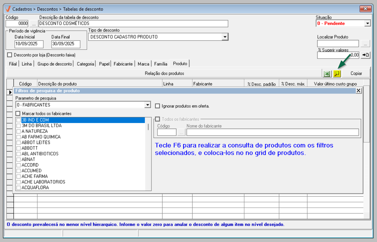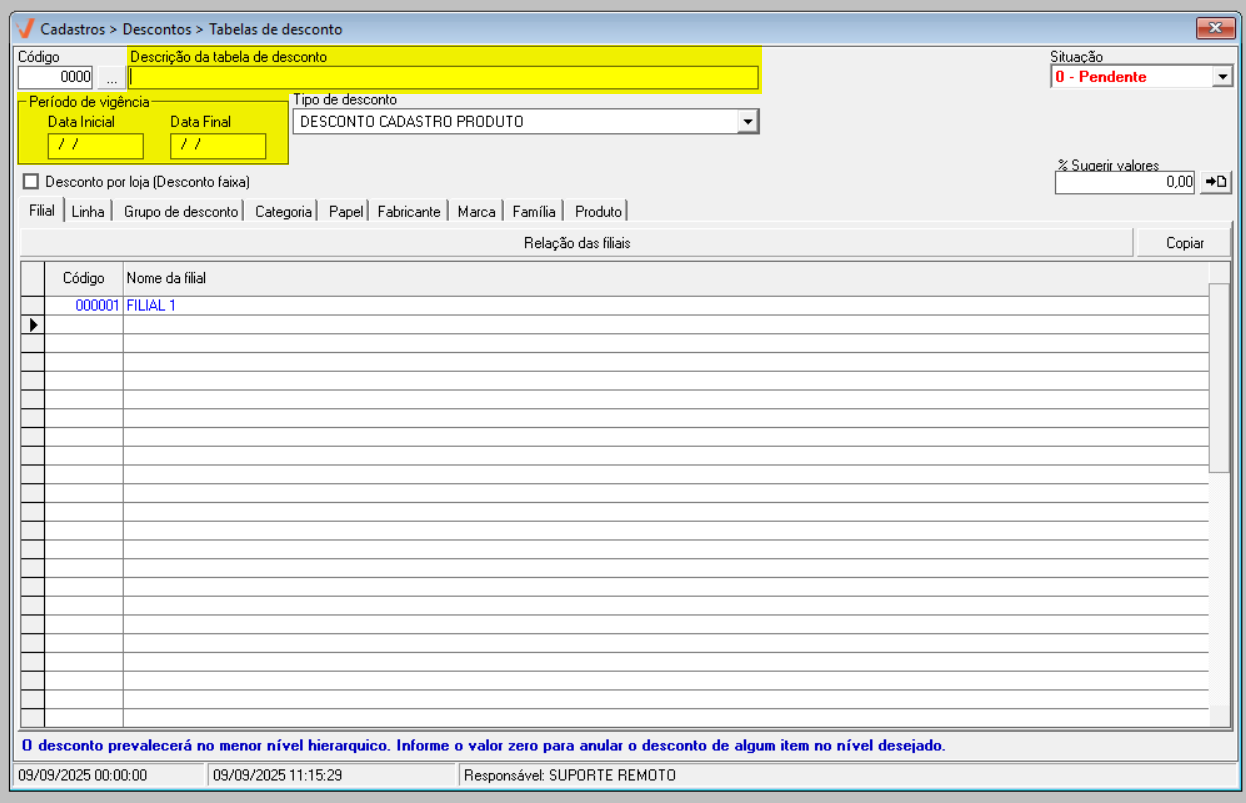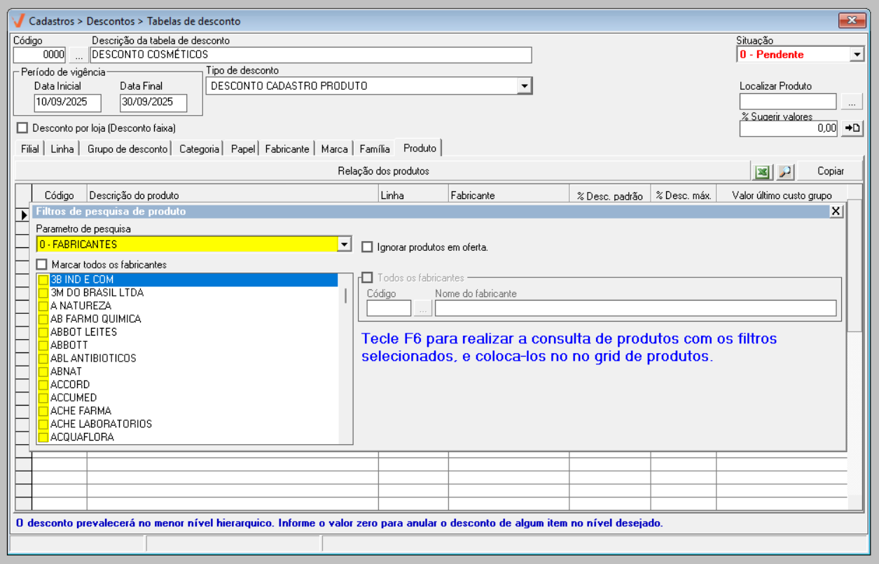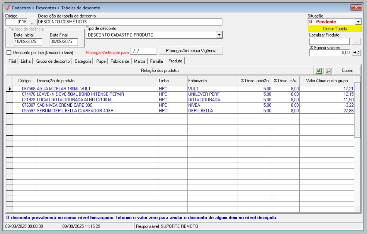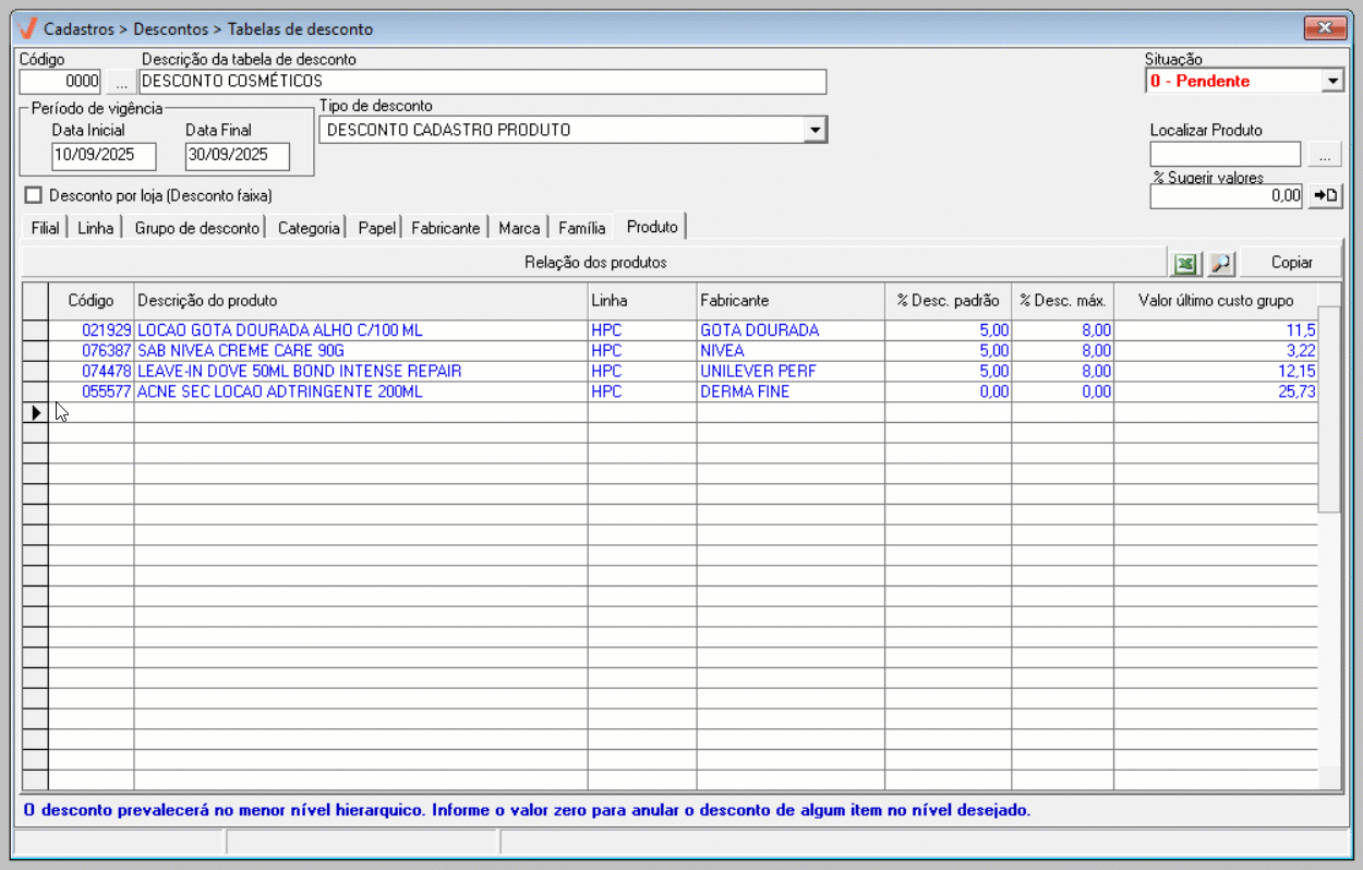 - Para realizar o cadastro de uma tabela de descontos é necessário que os produtos estejam previamente cadastrados no sistema.