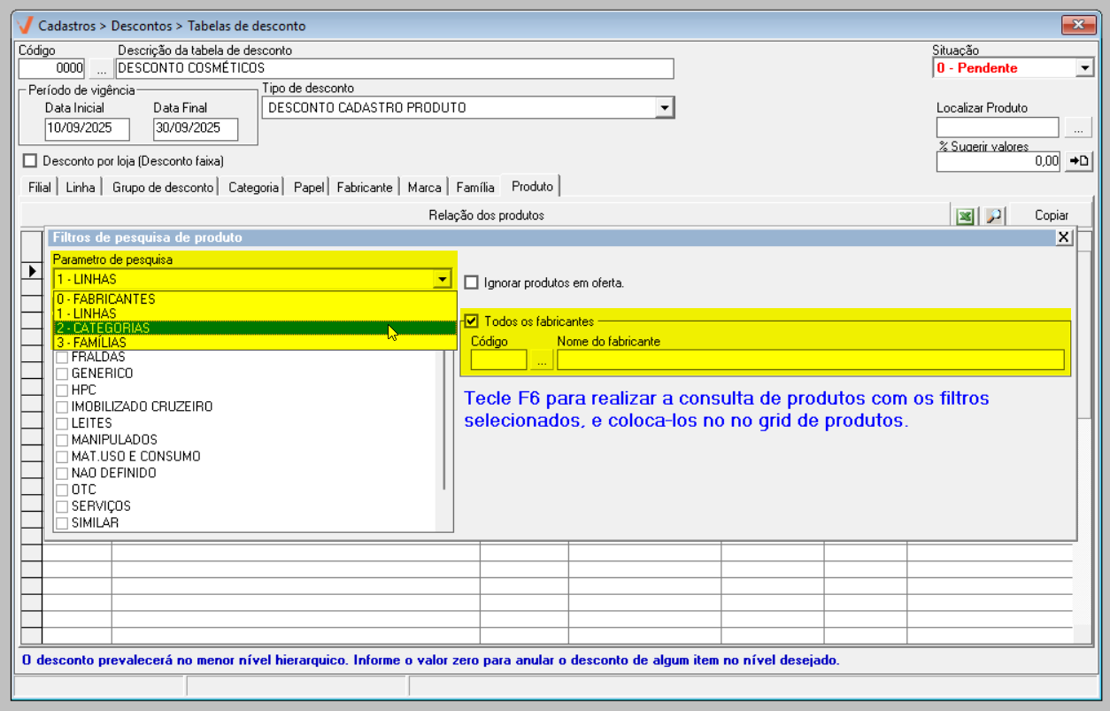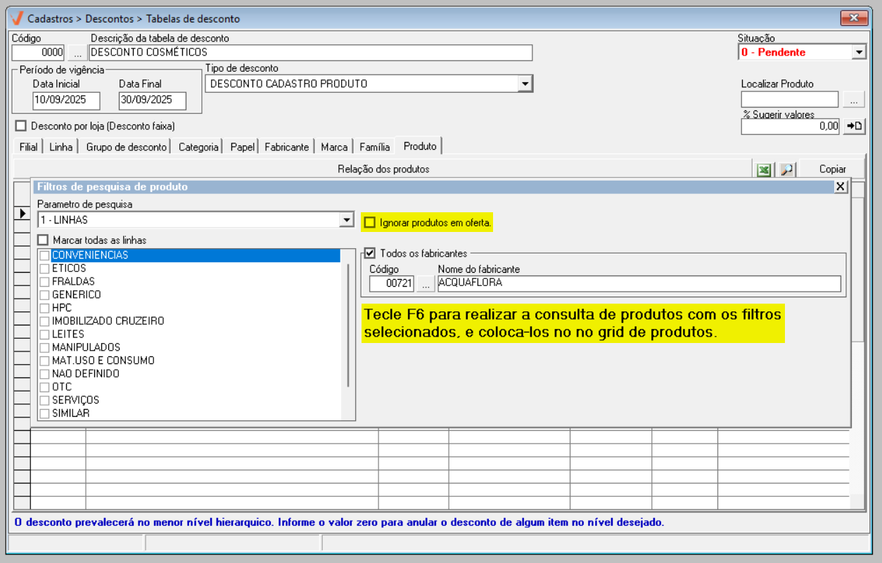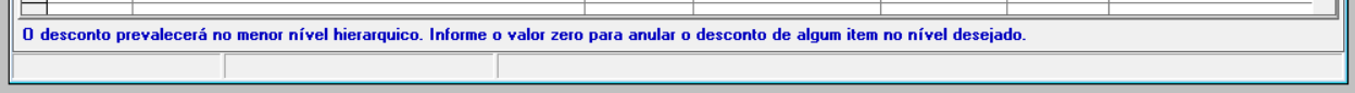 Outro aspecto importante a ser destacado, é o informativo no rodapé da tela, "O desconto prevalecerá no menor nível hierárquico". Por exemplo, caso o usuário defina 50% de desconto na aba de Linhas e 40% na aba de Produto, o sistema aplicará o desconto de 40%, que corresponde ao nível mais detalhado, ou seja, o produto específico. Em resumo, os valores configurados no nível mais específico sempre prevalecerão sobre aqueles definidos em níveis mais gerais, como a linha de produtos.