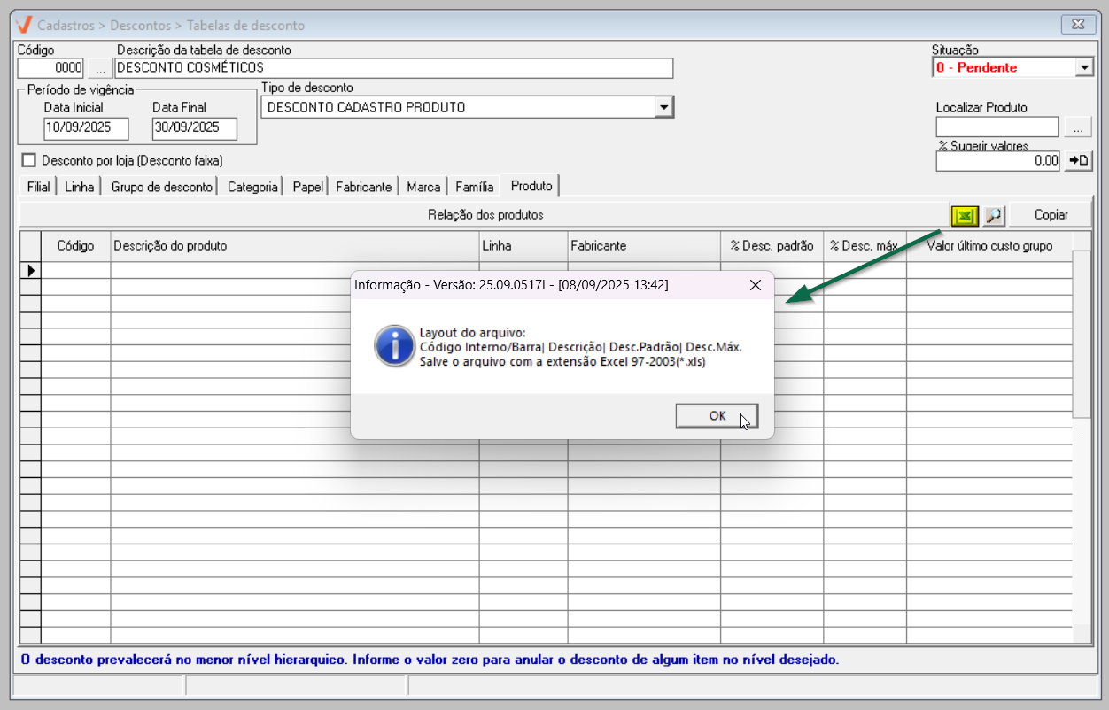 O método de importação permite ao usuário inserir todos os produtos e suas respectivas configurações de desconto, desde que o arquivo esteja corretamente formatado de acordo com o layout aceito pelo sistema. Para utilizar essa opção, clique no botão com o ícone do "Excel" para visualizar o layout aceito pelo sistema.