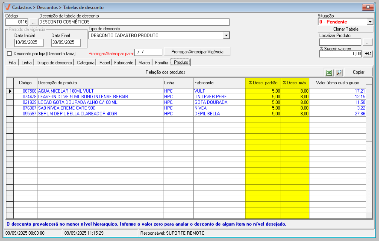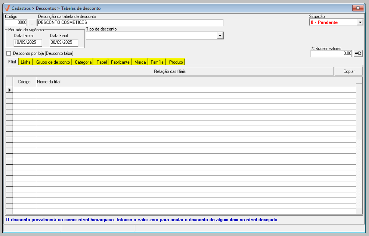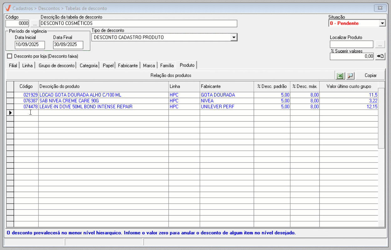 - Pendente: A tabela de desconto ainda não está disponível para uso. Ela poderá ser utilizada apenas quando o seu prazo de vigência começar.