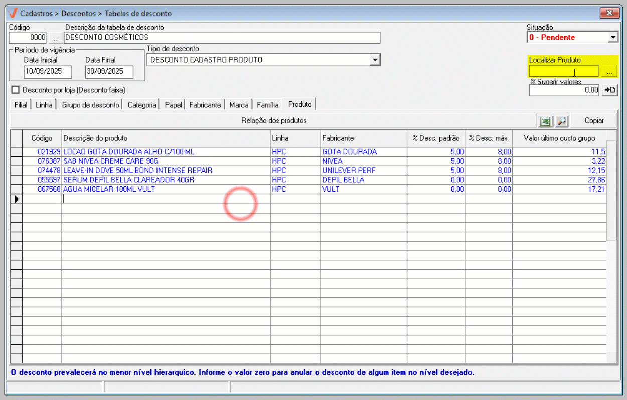 O próximo passo é informar o percentual de desconto que será aplicado ao registro. Para isso, utilize a linha das colunas "% Desc. padrão" e/ou "% Desc. máximo" para informar o percentual desejado. Tecle >> Enter após cada informação para mudar de campo e repita todo o processo para inserir todos os itens e descontos correspondentes, conforme desejar. Se preferir, para facilitar na busca dos registros para os quais deseja inserir um valor específico, o usuário poderá utilizar o campo "Localizar produto" para localizar o registro adicionado, basta inserir o código do produto e teclar >> Enter. Ao fazer isso, o sistema indicará, através de uma seta "", o produto na lista, caso ele esteja relacionado. Veja o exemplo: