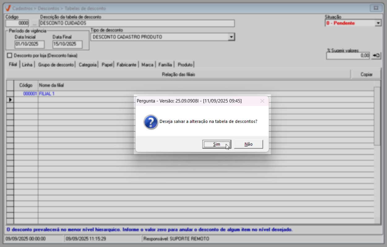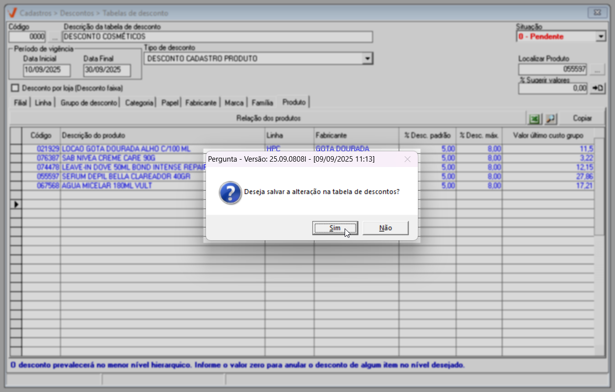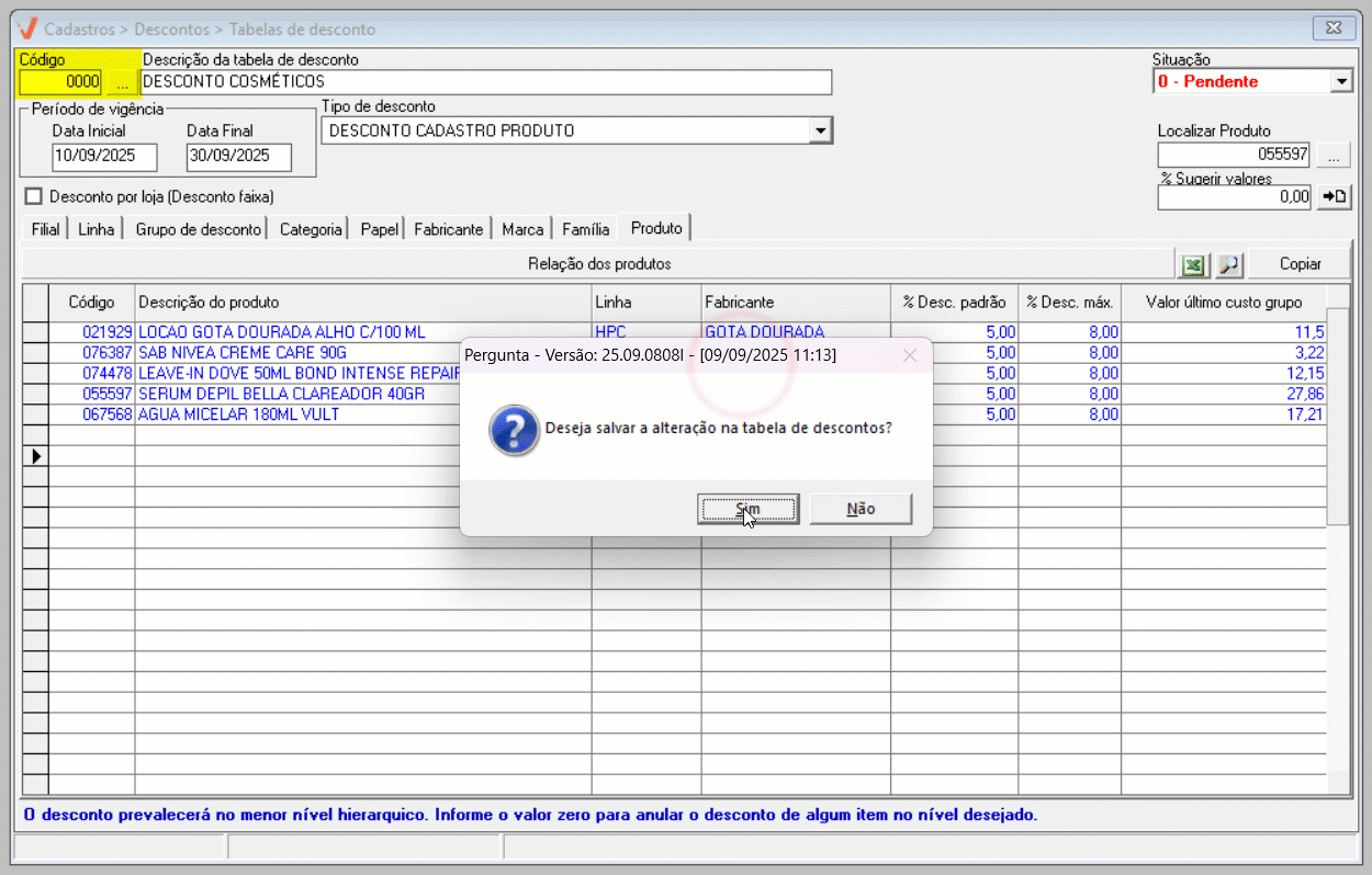 Para concluir o cadastro, pressione a tecla F2 para salvar. Em seguida, será exibida a mensagem "Deseja salvar a alteração na tabela de descontos?", clique em "Sim" para confirmar a operação. Logo depois, uma nova mensagem será apresentada informando "Registro gravado com sucesso". Clique em "Ok" para confirmar e a tela será automaticamente limpa, permitindo o início de uma nova operação.