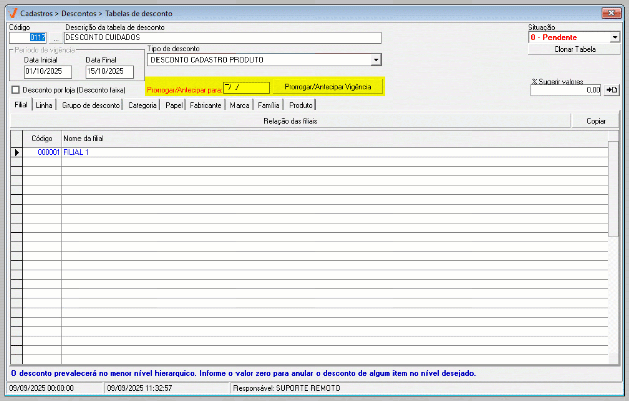 - Vigente: A tabela de desconto está ativa e disponível para uso imediato. Ela está em funcionamento dentro do sistema, sendo aplicada conforme o estabelecido.