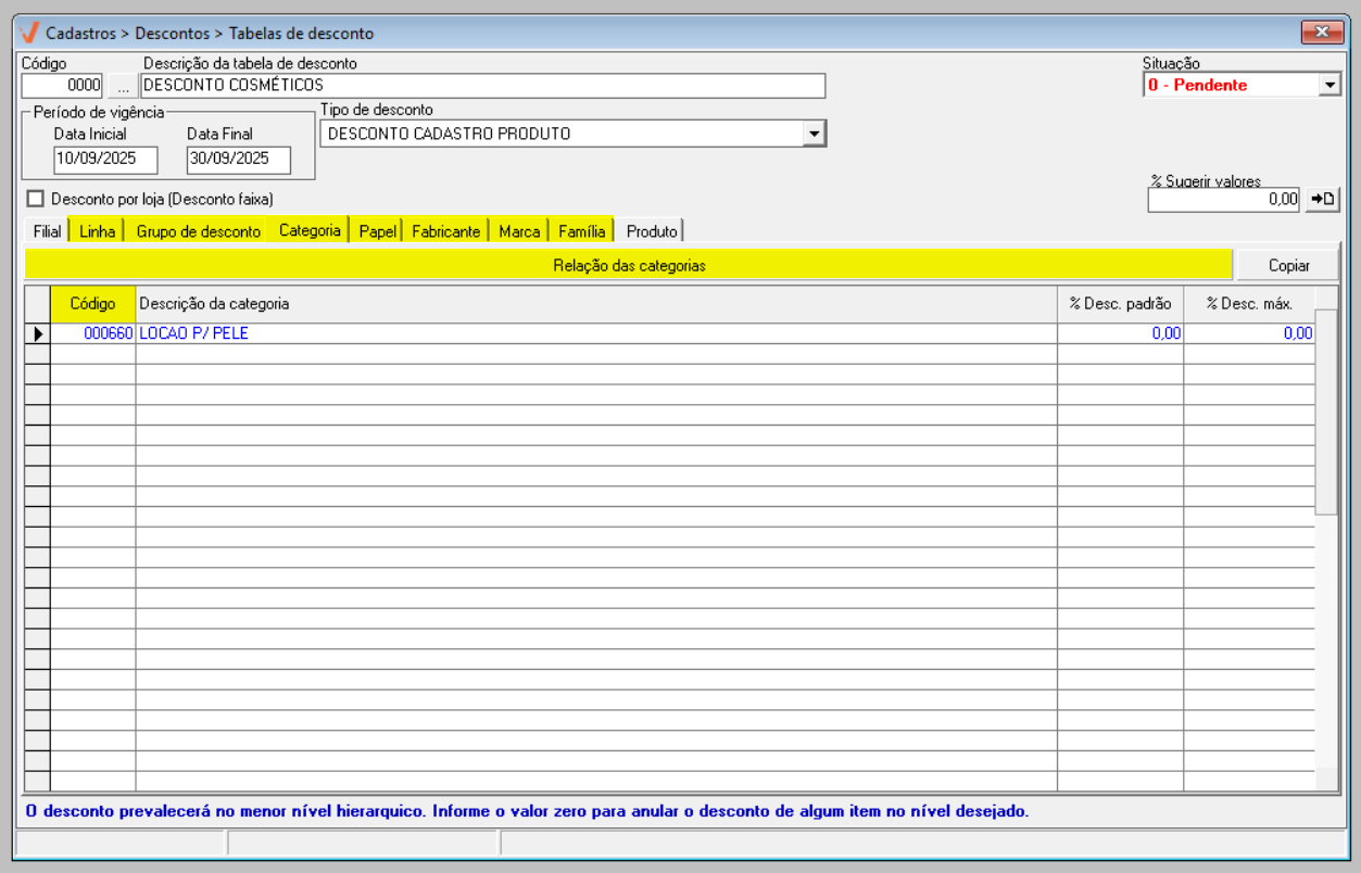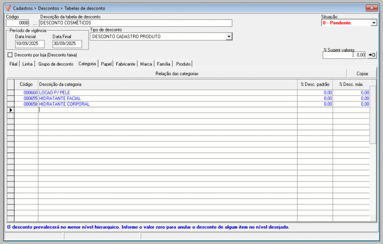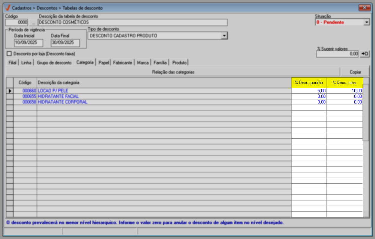 O próximo passo é informar o percentual de desconto que será aplicado ao registro. Para isso, utilize a linha das colunas "% Desc. padrão" e/ou "% Desc. máximo" para informar o percentual desejado. Tecle "Enter" após cada informação para mudar de campo e repita todo o processo para inserir todos os itens e descontos correspondentes, conforme desejar.