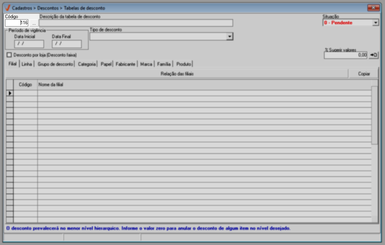 Continuando com o cadastro, o próximo passo é configurar os detalhes dos descontos por meio das abas disponíveis na seção abaixo. Comece pela aba "Filial" e adicione todas as filiais que irão se submeter à tabela de descontos. Para isso, utilize as linhas da coluna "Código" para informar o o código de cadastro da filial, tecle >> Enter para revelar o nome correspondente no campo à frente. Se preferir, clique em "Relação das filiais", para acessar a tela de consulta de filiais.